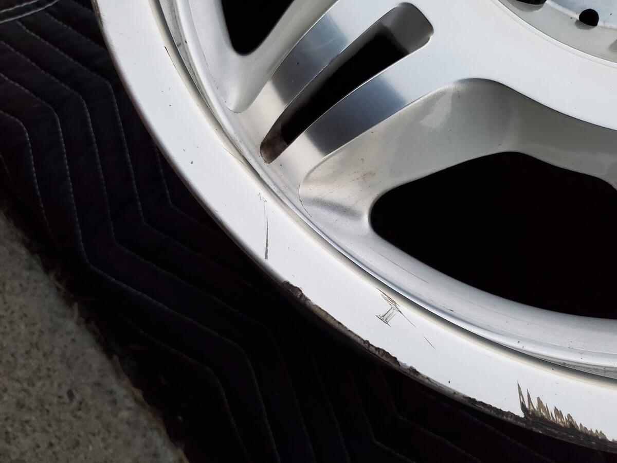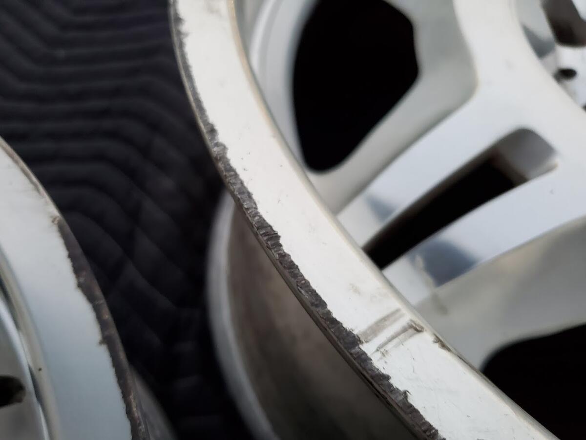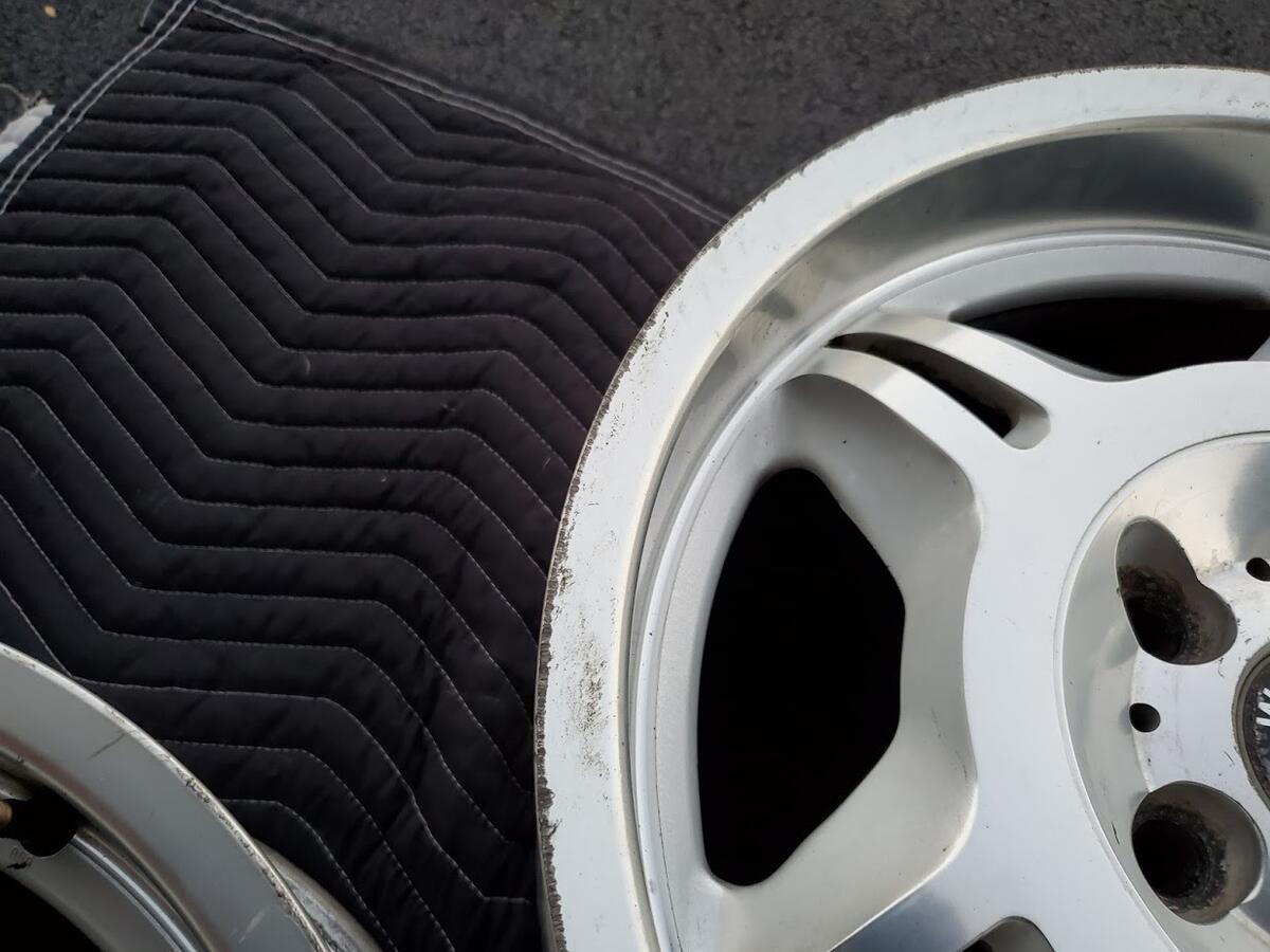 Wheels are in fair to good used condition with lots of shallow curb rash throughout, and a few spots of deeper, more jagged curb rash. Cosmetically I would rate them a 6.5-7 out of 10. One rear wheel has a crack. I have not had that wheel inspected by a professional to see if the crack is repairable. I have factored the possibility that this wheel cannot be repaired into the price.