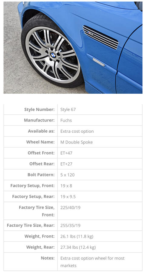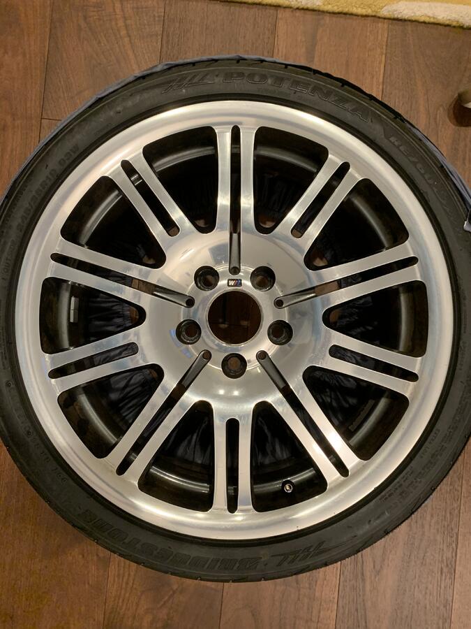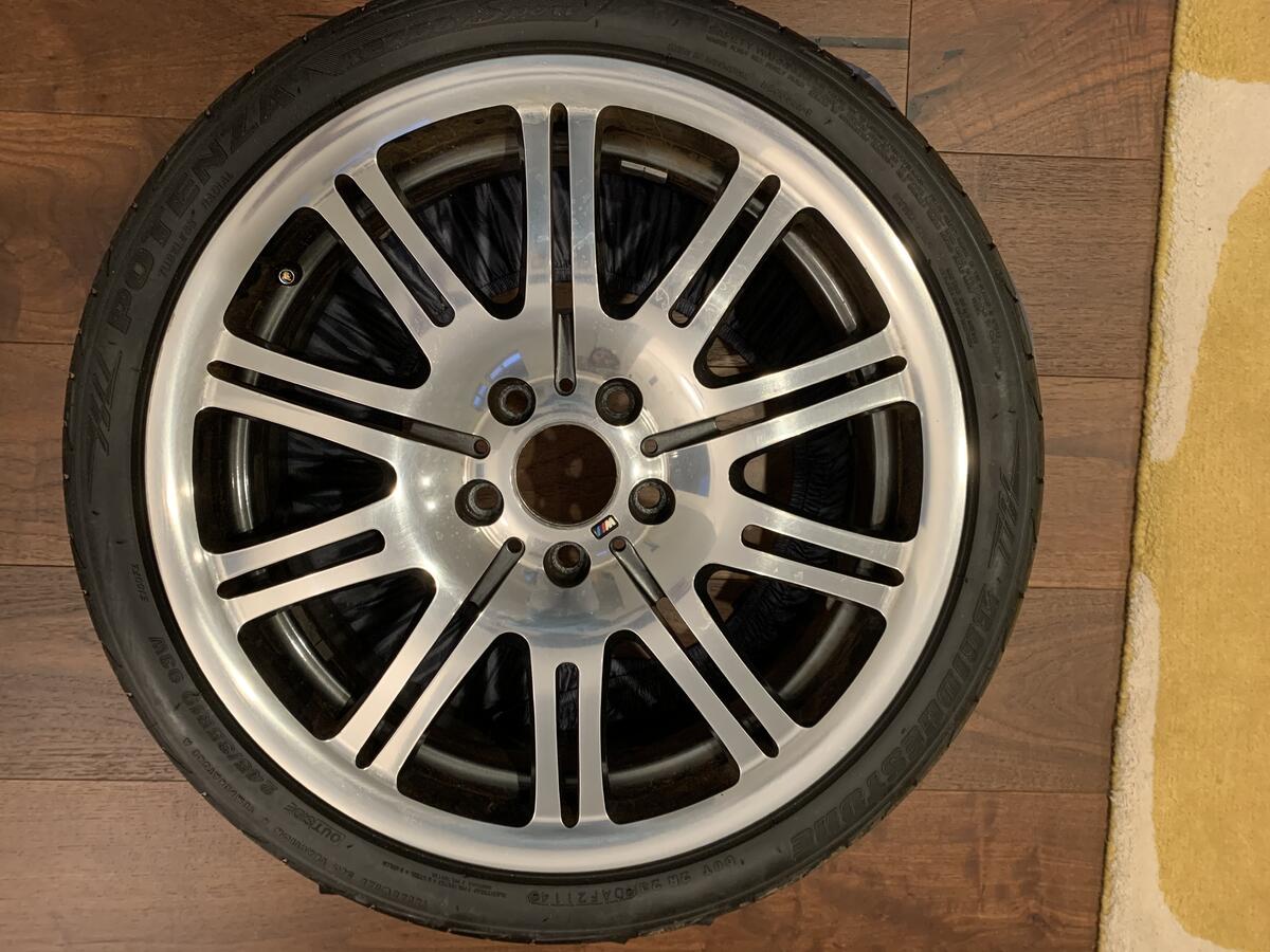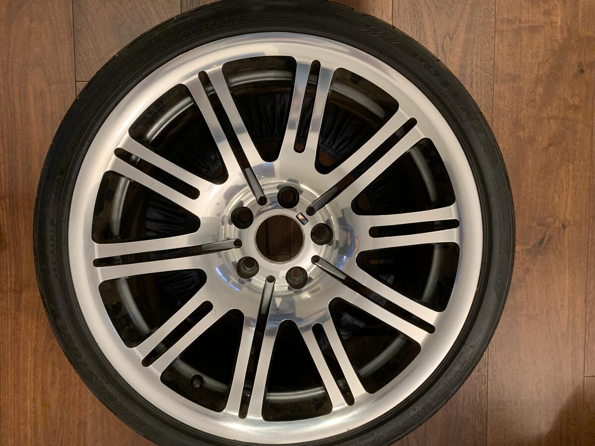 Hi all. I'm selling the original wheels my E46 M3 came with. These are the optional Style 67 (chrome) 19" wheels. They are in good shape as you can see in the pictures. One has a noticeable curb rash. The tires are Bridgestone Potenza from 2015 and I estimate they have 18-20k miles. They have some tread left but are six year old tires so best to buy new ones.