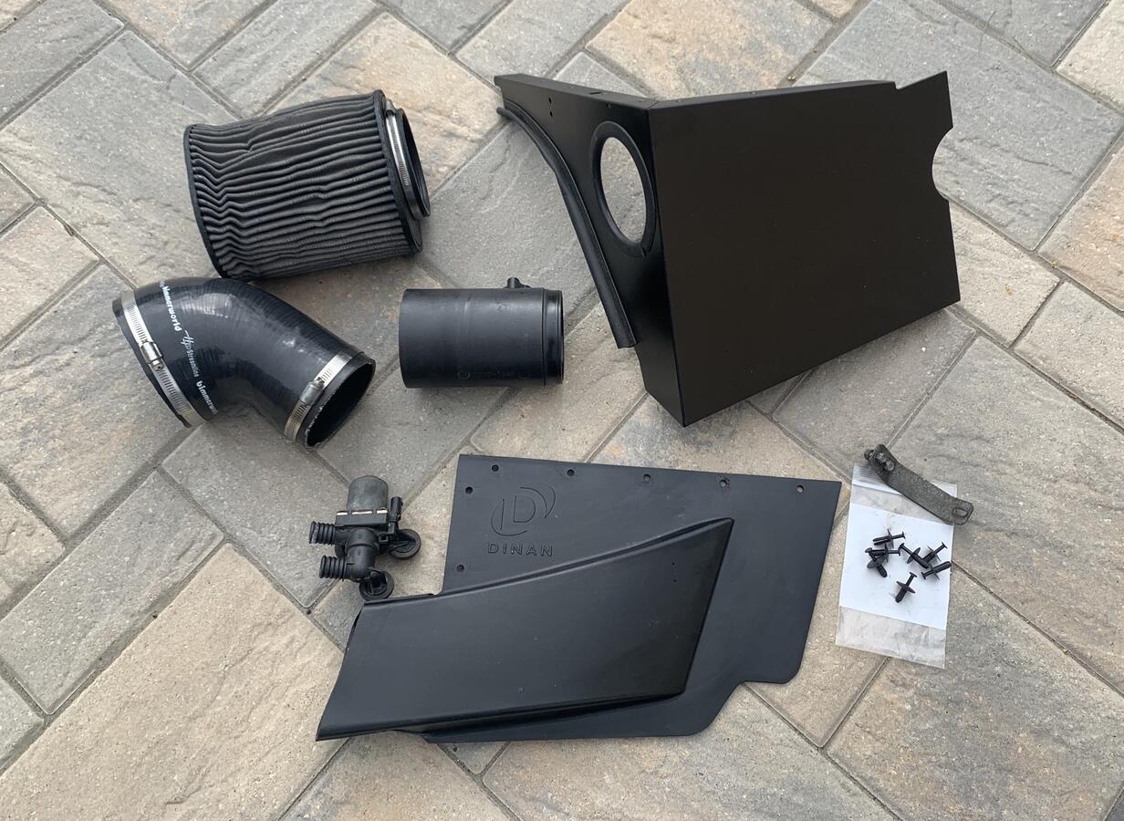 This is discontinued piece, considered the best intake below CSL airbox, was very happy running it for several years until I upgraded to CSL airbox there for do not need this anymore. Included Dinan intake along with necessary hardware also included are BimmerWorld streamline Elbow and E46/CSL Aux pump Heater control valve which eliminates need for Dinan heater aux pump relocation bracket for original aux pump, plus as added benefit it much lighter than original pump providing some weight savings (about 2lb vs oe pump) it plugs directly into oe connectors no modification necessary. Normal wear, filter showing it’s age but still very useable, see pictures for details