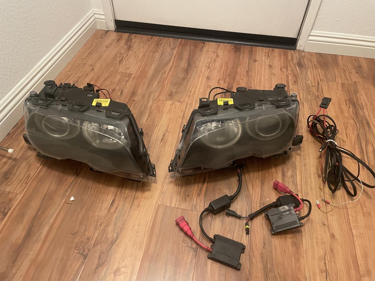 For sale is a set of E46 M3 headlights. They are in good working condition, with a typical amount of lens hazing. A couple tabs are broken and the plastic cover on the drivers headlight is missing as seen in the pictures. Will include the wire harness to power the angel eyes already installed. Bot sure what the other 2 controllers are for, I think they are ballast for the upgraded bulbs it has in it, not sure though. What you see is what you get. $150 picked up, $200 shipped.