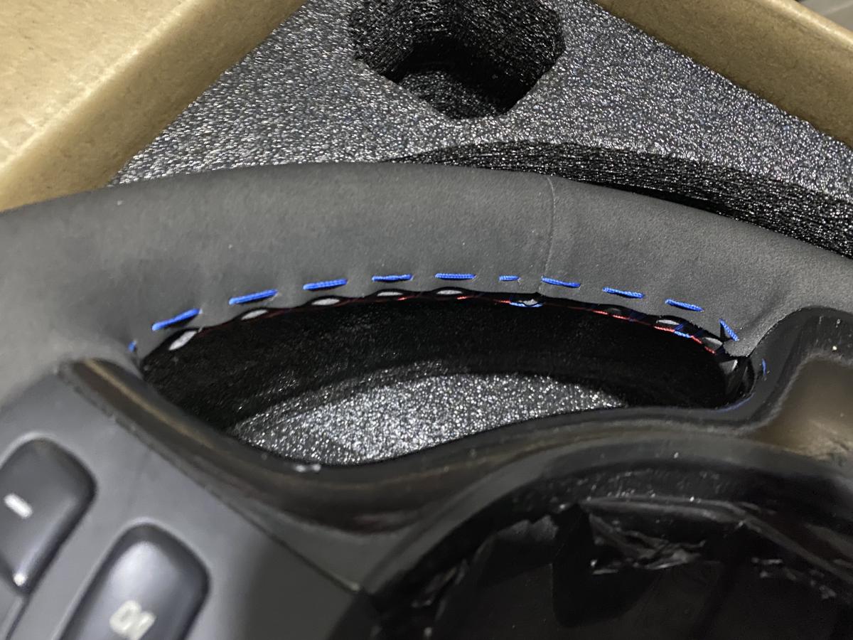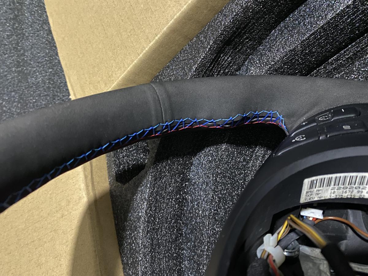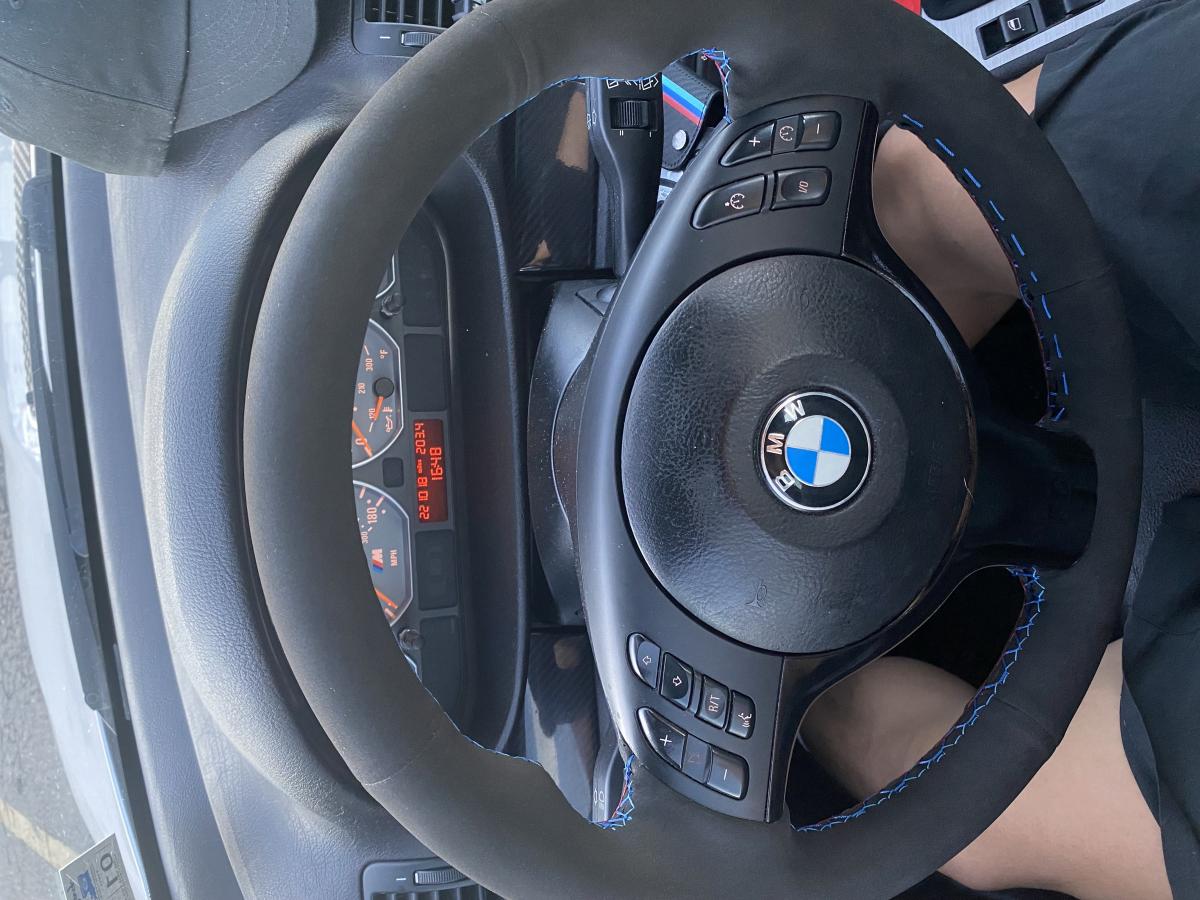 Selling used E46 M3 steering wheel. Rewrapped in black alcantara with tri stitching. Bottom right light blue stitching ripped during the process and i proceeded to just use the blue stitching. I also attempted to wrap the lower trim in gloss black and didn't do a good job but it's not noticeable once the airbag is installed. Overall, it's not the perfect wheel but it's snug and doesn't slide around the old leather underneath. It's a good touchup to someone just looking to replace their old leather steering wheel that is falling apart.
