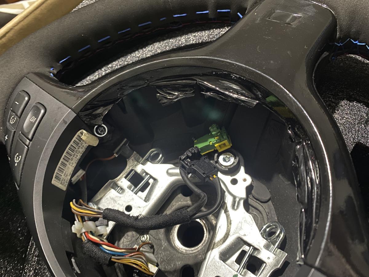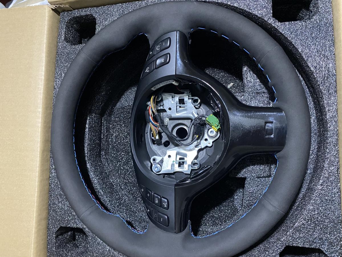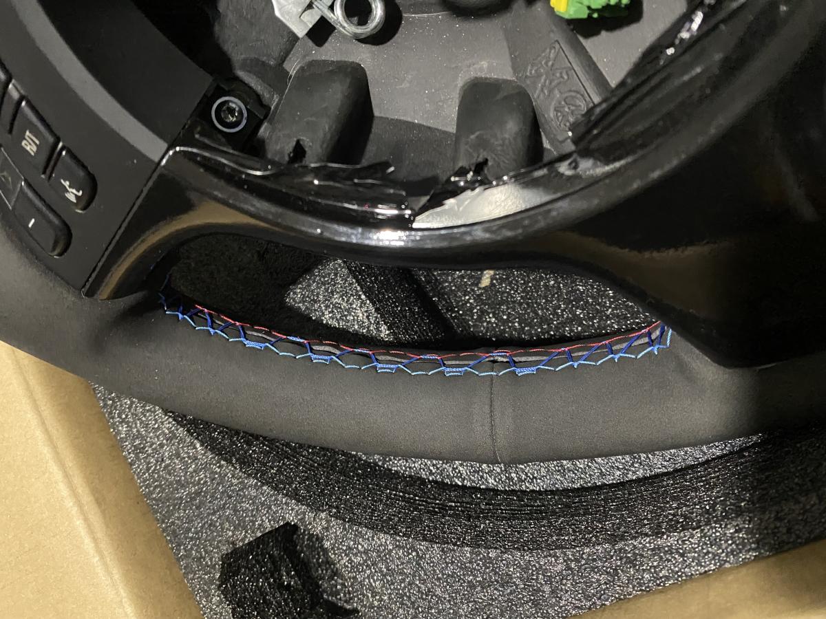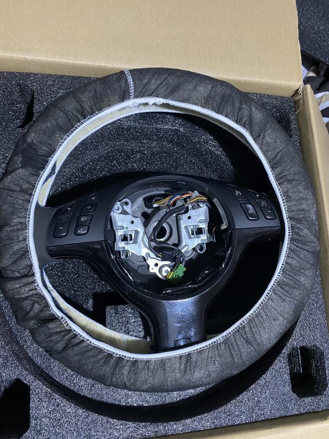 Selling used E46 M3 steering wheel. Rewrapped in black alcantara with tri stitching. Bottom right light blue stitching ripped during the process and i proceeded to just use the blue stitching. I also attempted to wrap the lower trim in gloss black and didn't do a good job but it's not noticeable once the airbag is installed. Overall, it's not the perfect wheel but it's snug and doesn't slide around the old leather underneath. It's a good touchup to someone just looking to replace their old leather steering wheel that is falling apart.