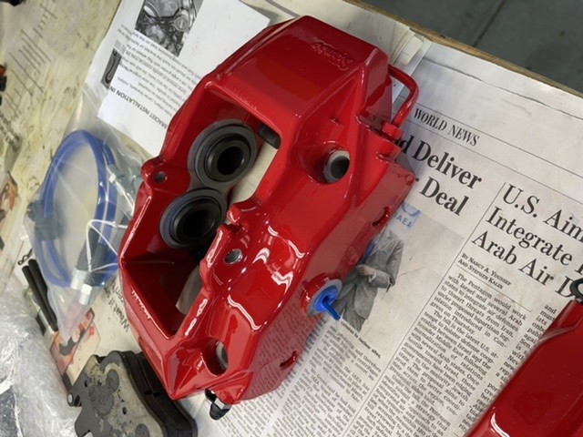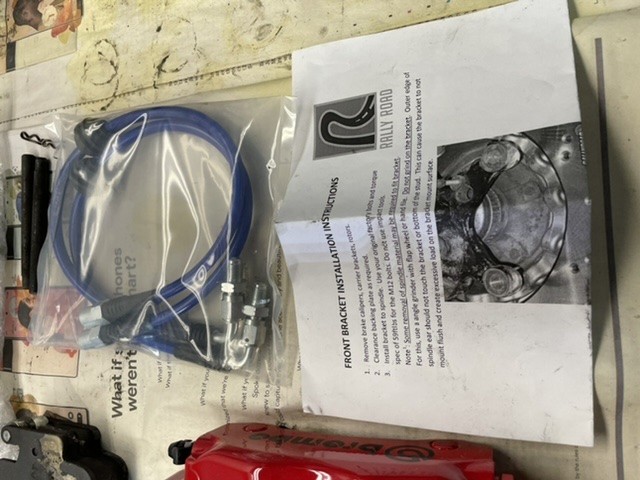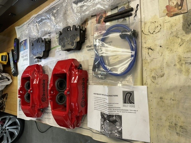 Rebuilt and powder coated front Brembo Porsche 996 brake calipers (machined 5.5 mm by Rally Road). Brake hardware + fresh bleeders. Rally road E46 M3 adapter kit, plus RR SS brake line kit. Two sets of used brake pads. All ready to bolt on to a set of ZCP rotors. Bought these for my own car, but then decided to go with the FreakyParts kit for the front (kept the rears).