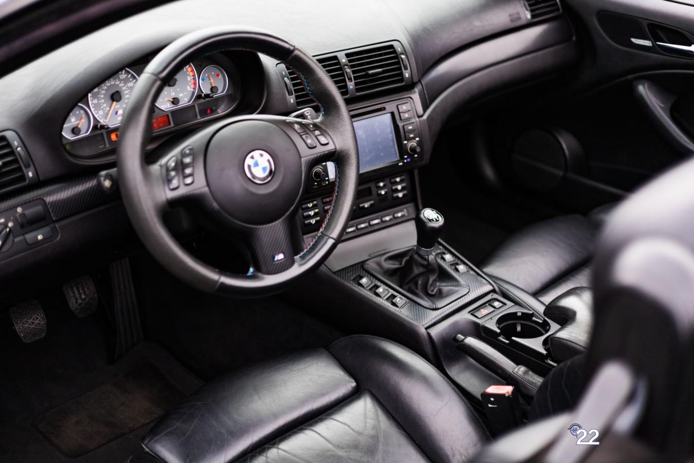 This E46 M3 has a few tasteful modifications done which include; Supersprint exhaust, H&R lowering springs, Rogue Engineering Short Shifter, OEM ZHP shift knob, BavSound speakers and tweeters, Eonon Bluetooth headunit, Carbon Fiber rear diffuser and carbon fiber wrapped interior trim.