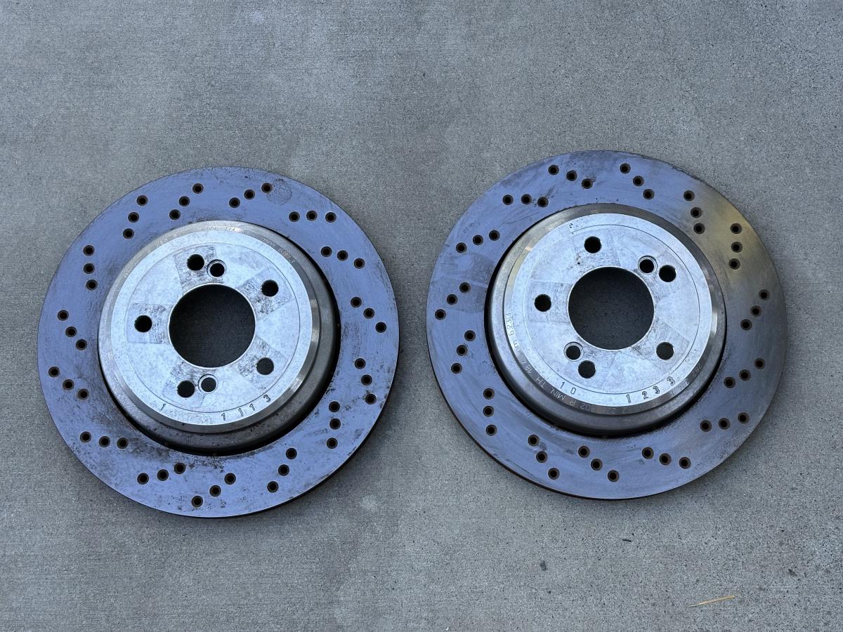 2x OEM BMW “Euro” drilled rotors. PN: 34212282303 (rear left), 34212282304 (rear right). Plenty of life left at 19.9mm+. Min for replacement is 18.4mm. $400 ($600+ new from FCP)
