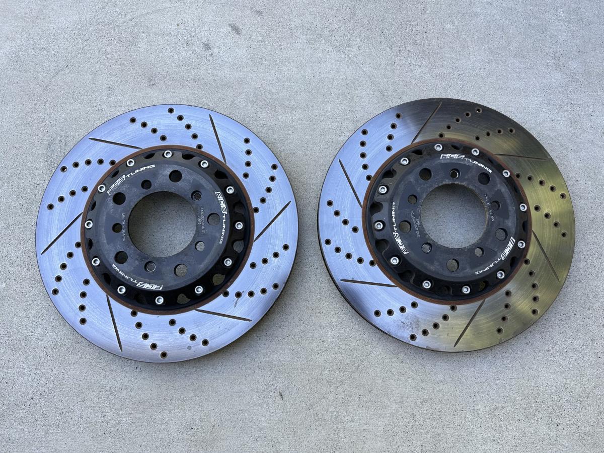 2x ECS 2-piece 328x20mm front brake rotors (non-CSL / non-ZCP). Plenty of life left at 28mm+. Min for replacement is 26.4mm. $500 ($700 new from ECS)