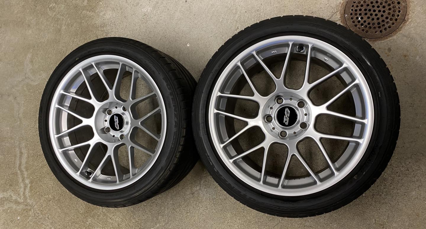 Buy these and get yourself a pair of fronts that are on sale right now from Apex to make a complete set on the cheap! I dont need these anymore since I switched to a square setup. One wheel has some small scuffs/scratches. Tires are 285/35R18 Bridgestone Potenza S-04 with about 5/32's left but arent worth much as they are discontinued. Looking to sell the pair as is semi locally initially for $350 OBO. I'm open to discussing shipping and selling nationally and tire removal if there's interest.