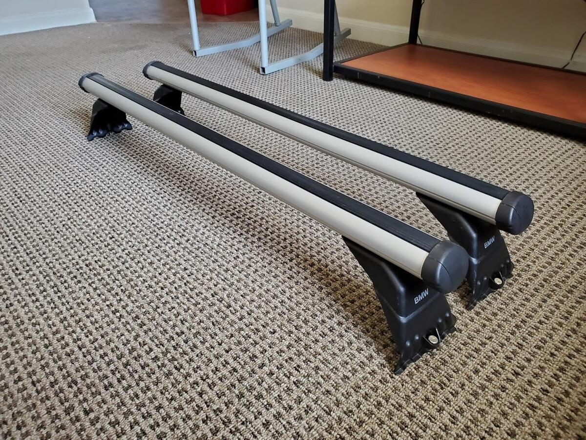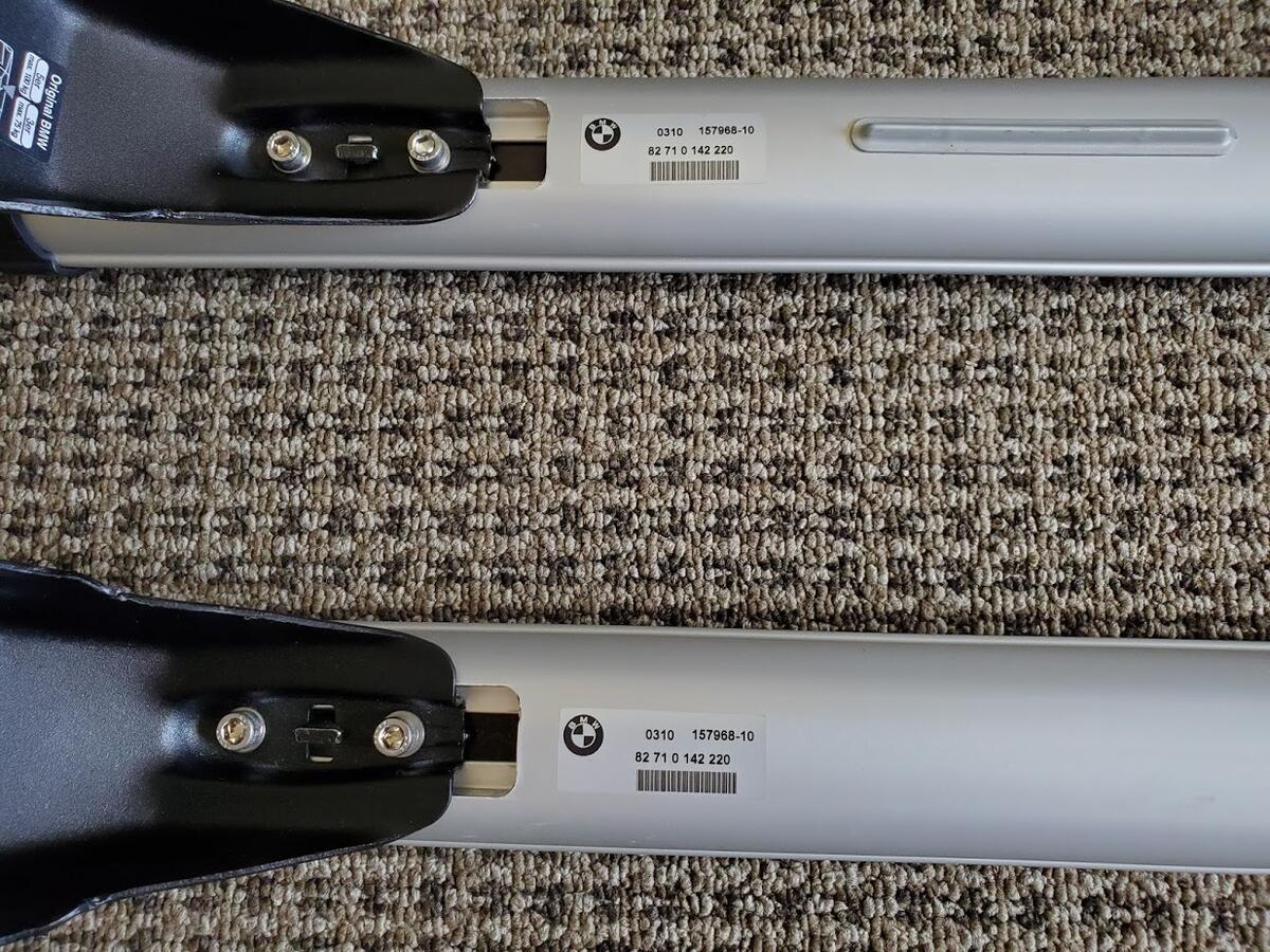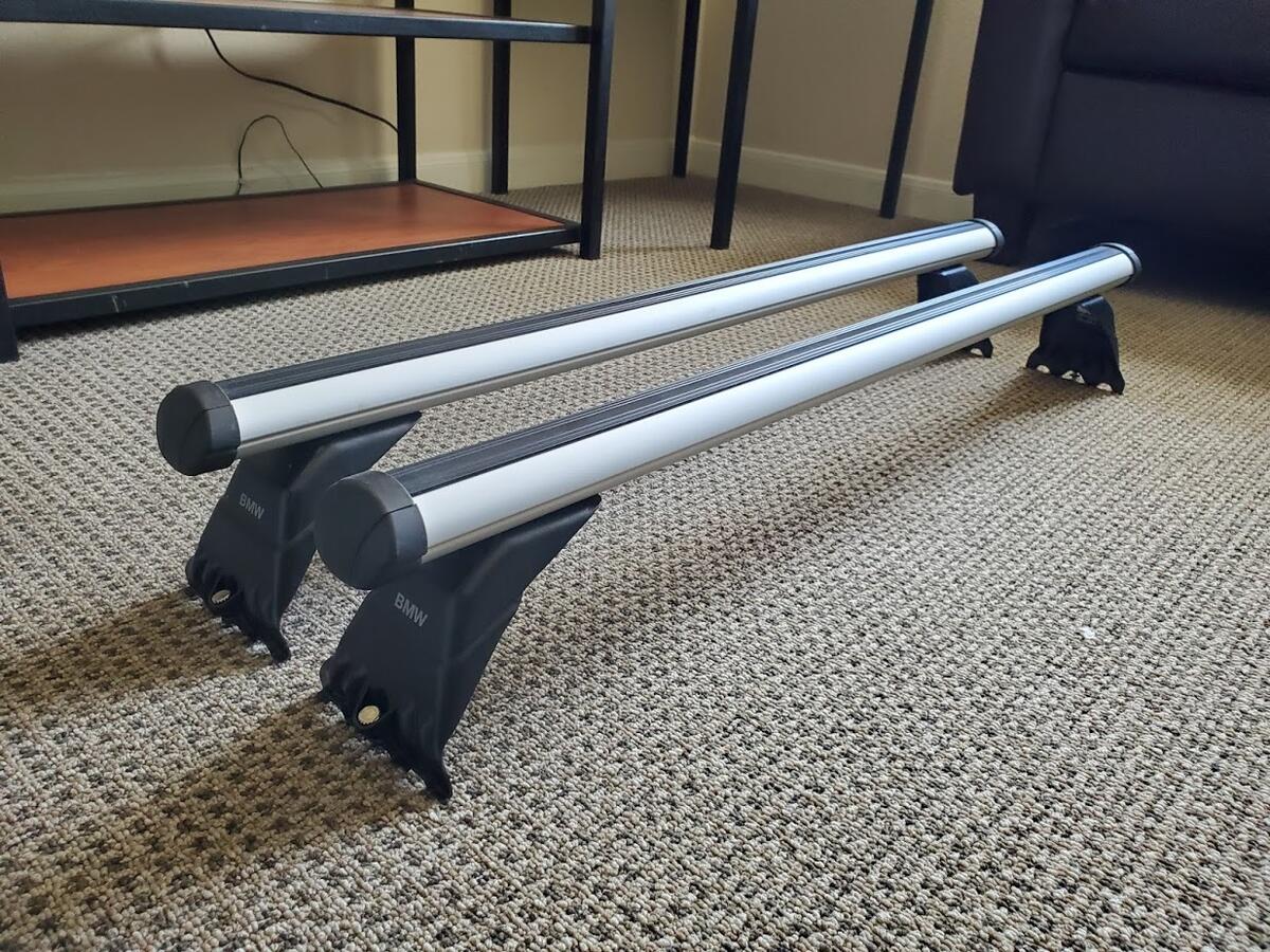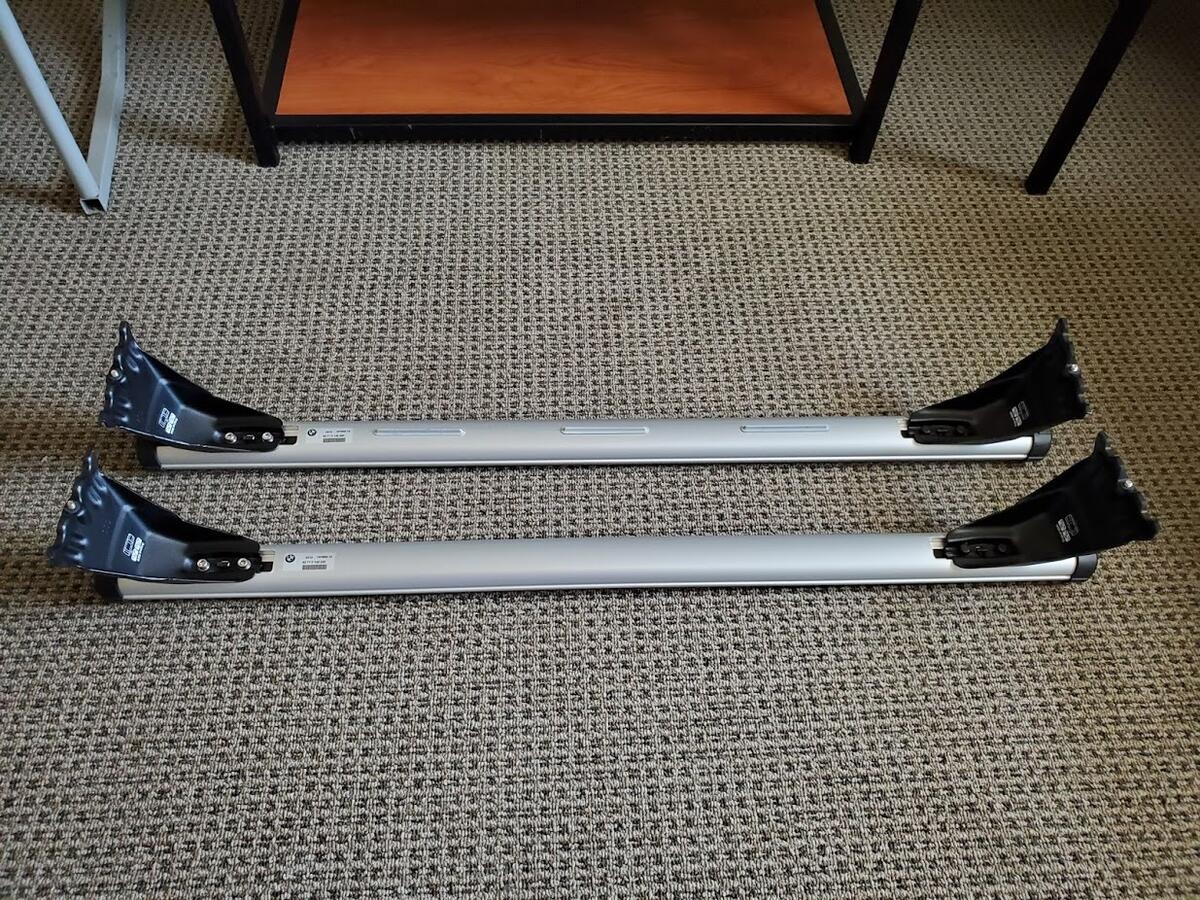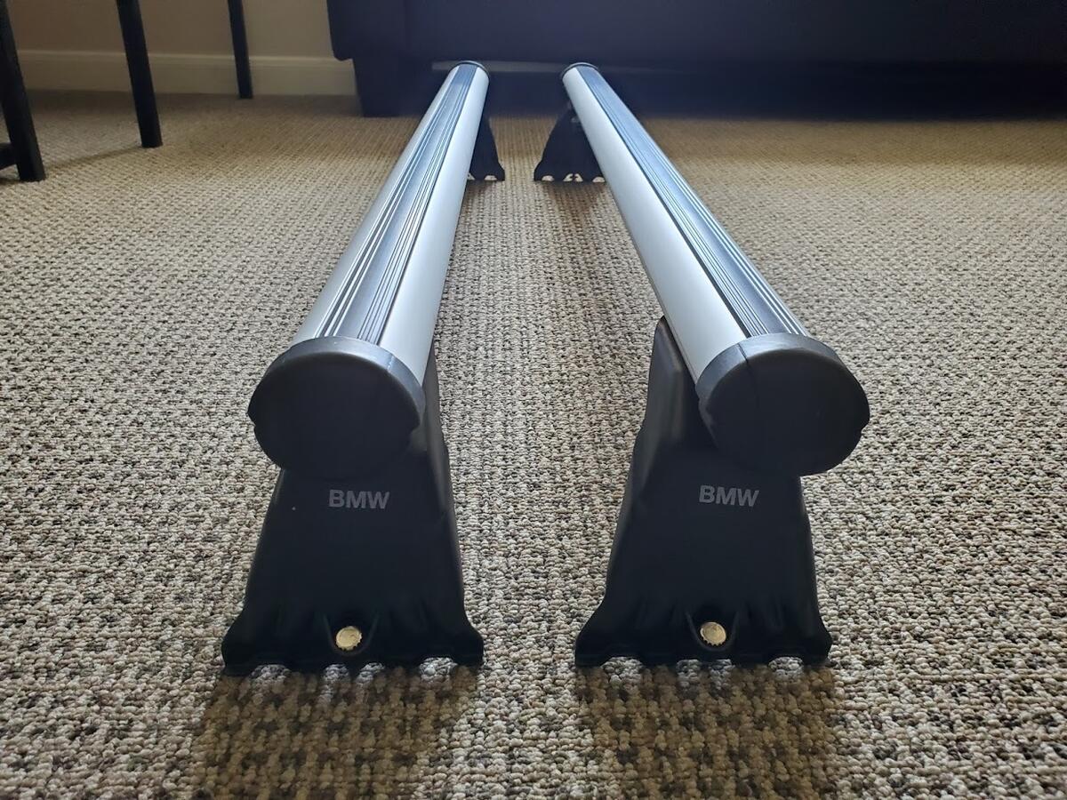 Up for sale is a set of OEM Roof Rack Bars for an E46 Coupe, E46 Sedan or E39 Sedan. Does not fit E46/E39 wagons. Fits our E46 M3s perfectly, and rated to hold 70 kg, (~154 lb) on our cars.