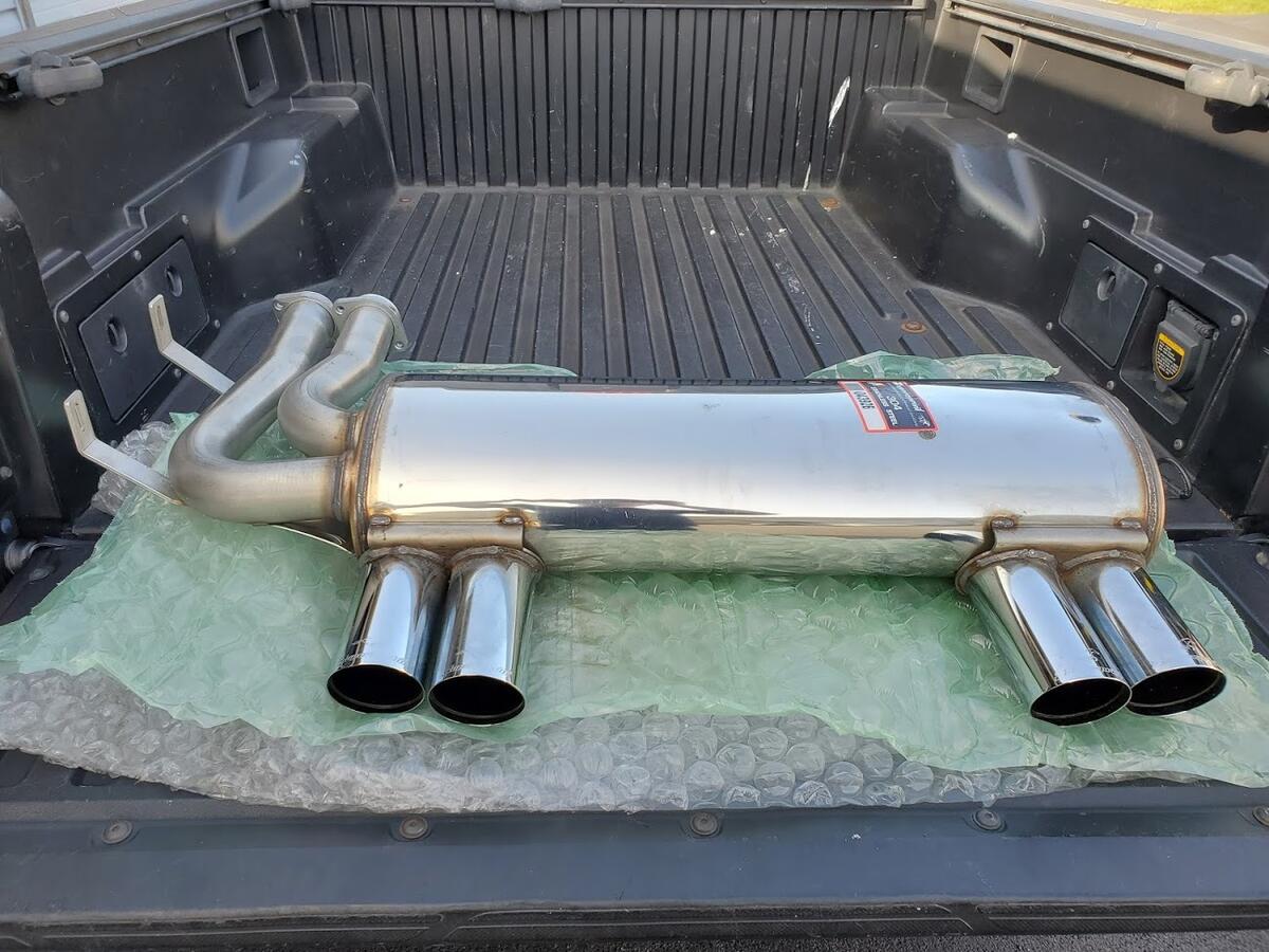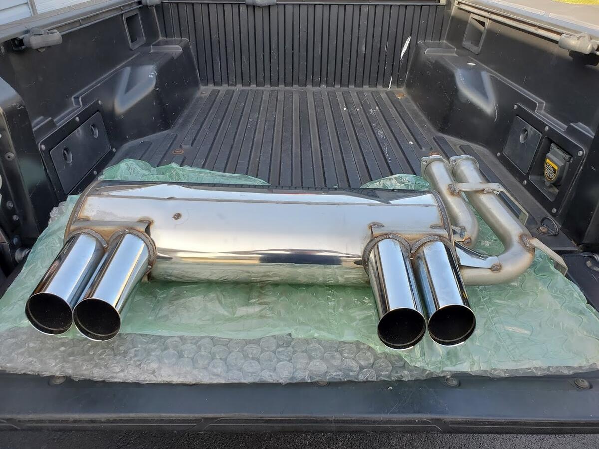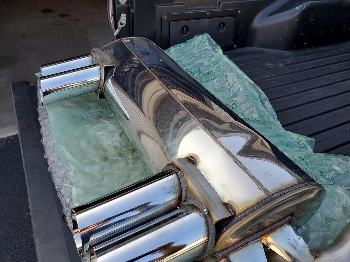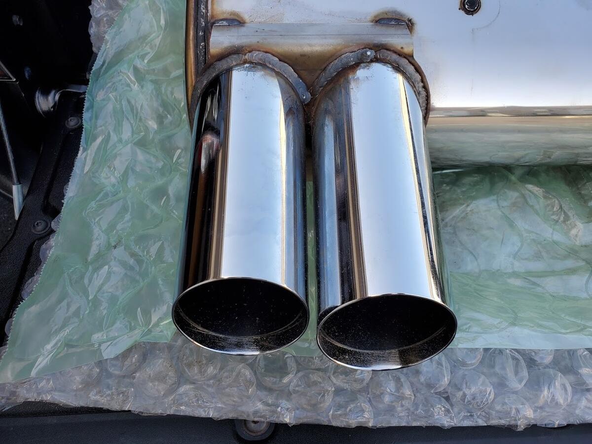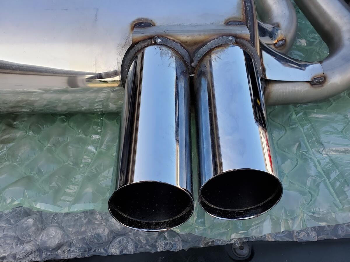 Muffler is new, and has never been fitted to a car. Body has 3 dents from shipping, 1 small one on the top and 2 larger ones on the bottom. Some small scratches on one side. Tips are undamaged, and none of the damage will be visible when installed unless your car is on a lift.
