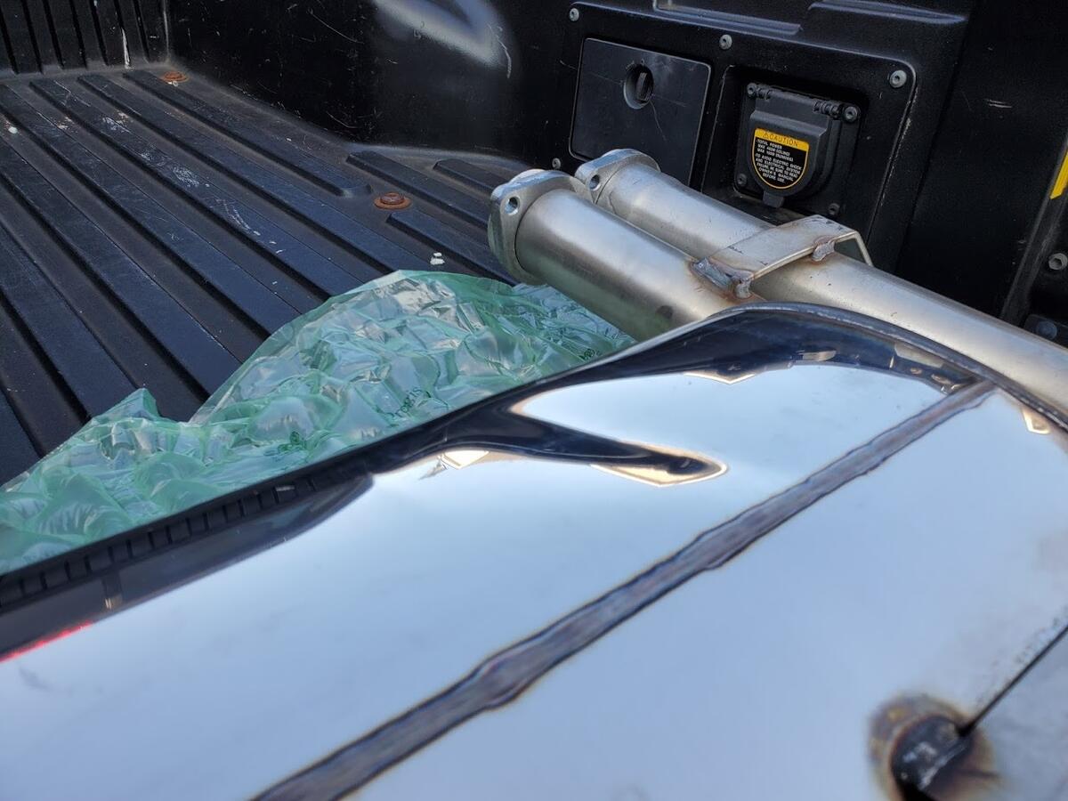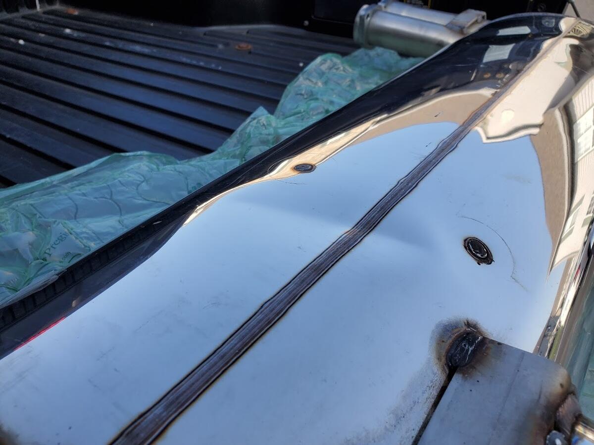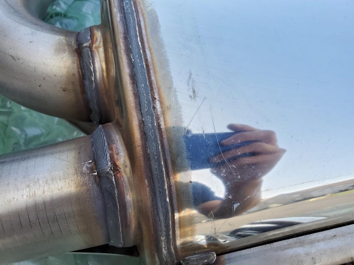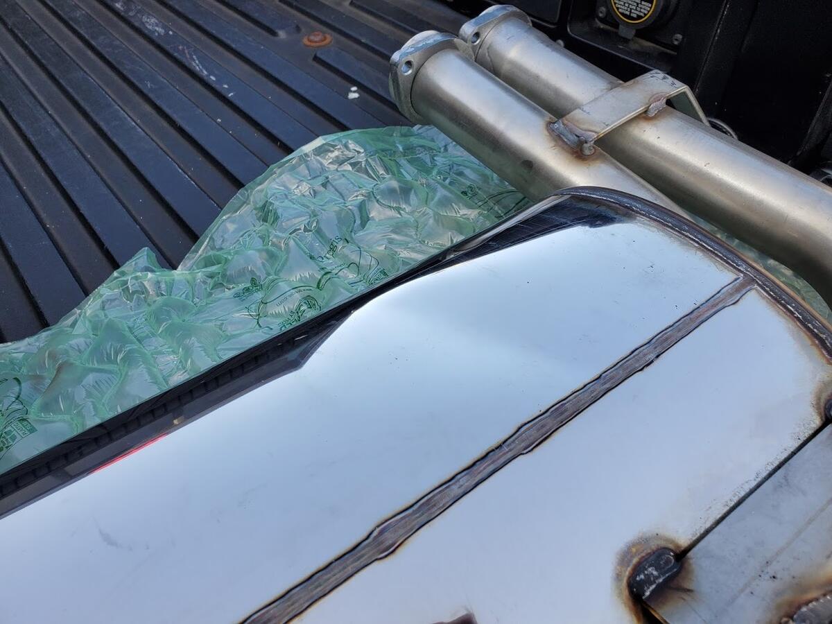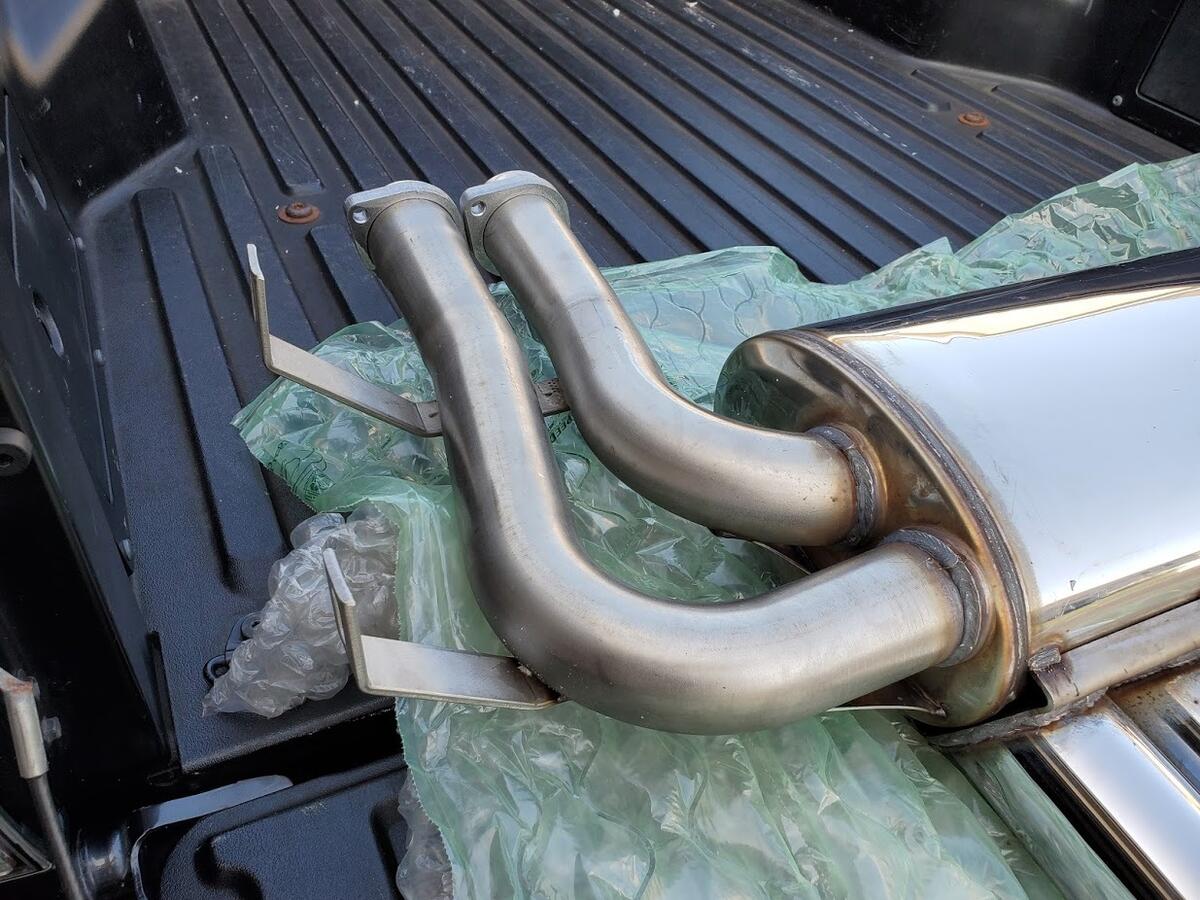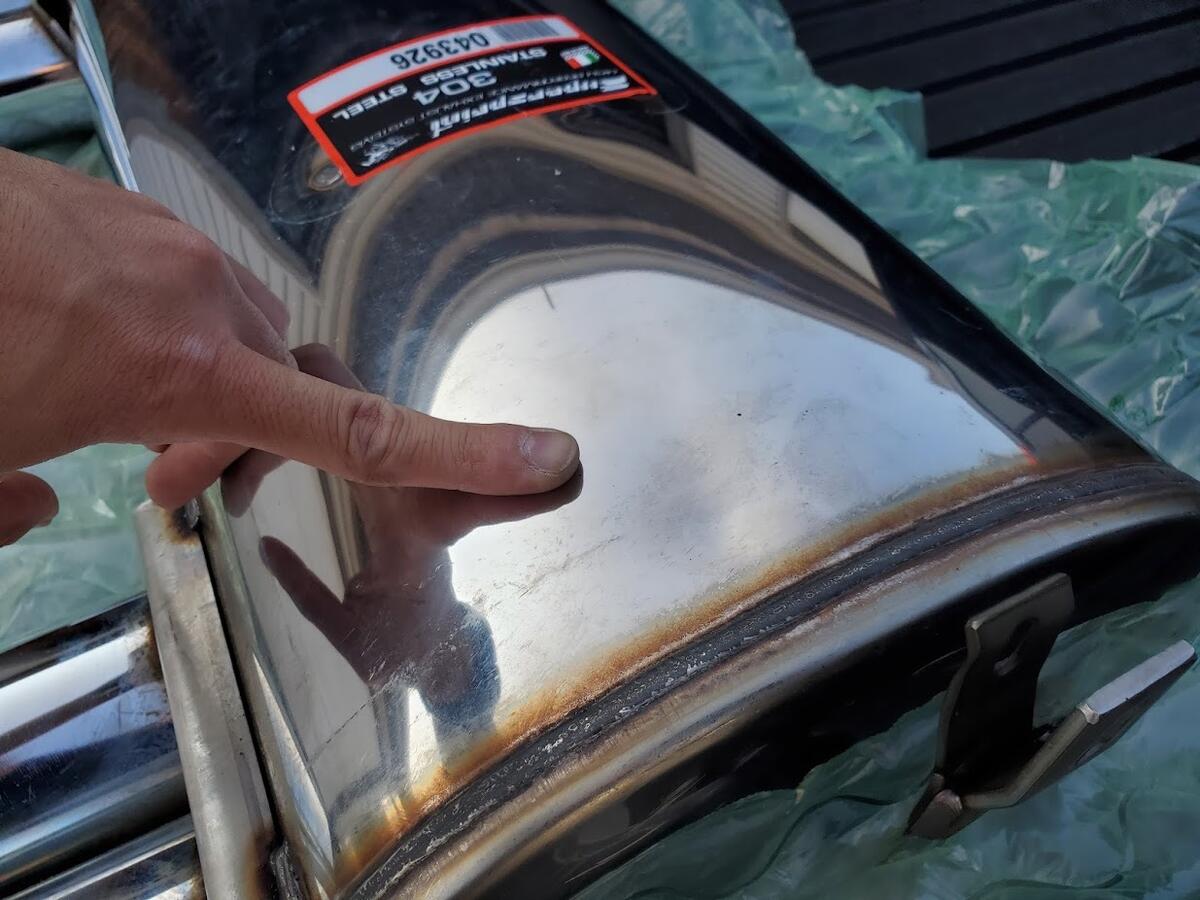 Muffler is new, and has never been fitted to a car. Body has 3 dents from shipping, 1 small one on the top and 2 larger ones on the bottom. Some small scratches on one side. Tips are undamaged, and none of the damage will be visible when installed unless your car is on a lift.
