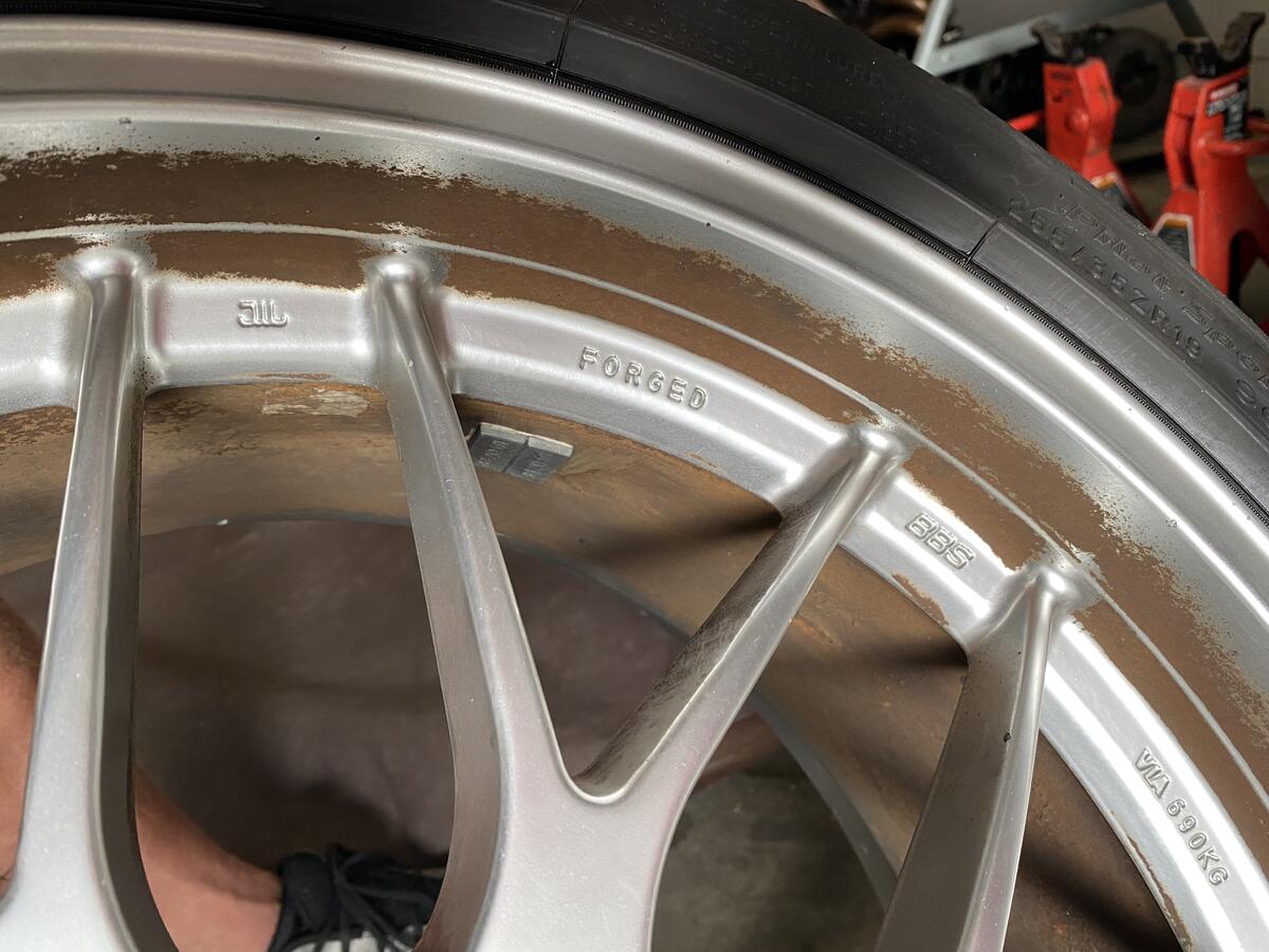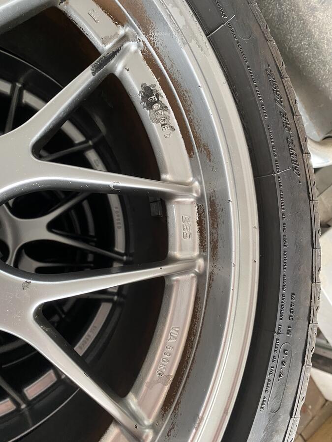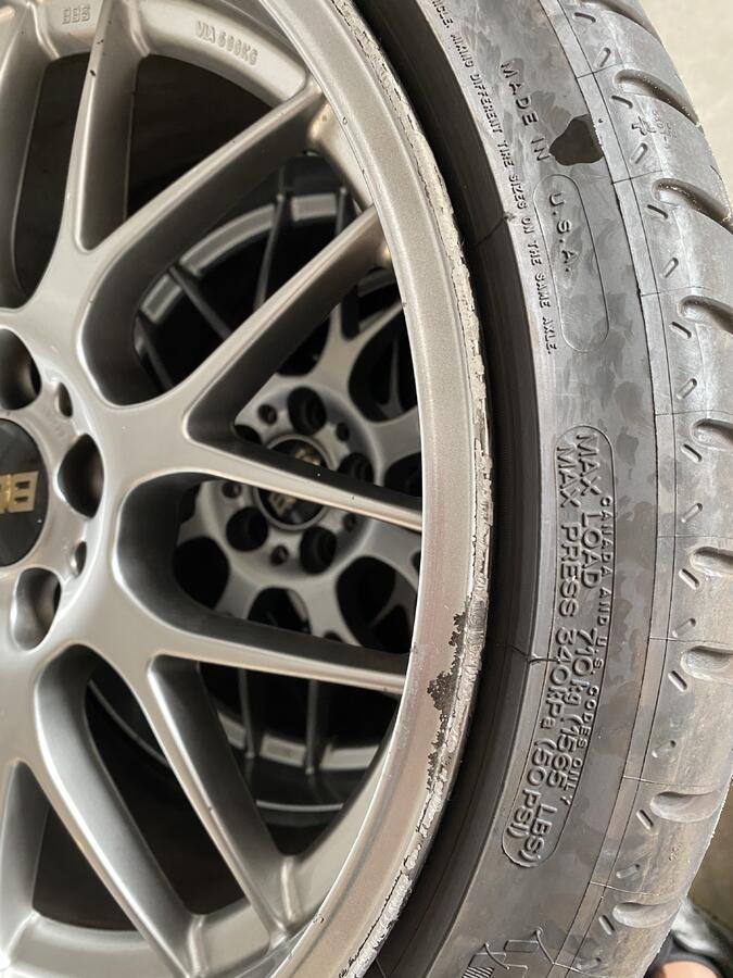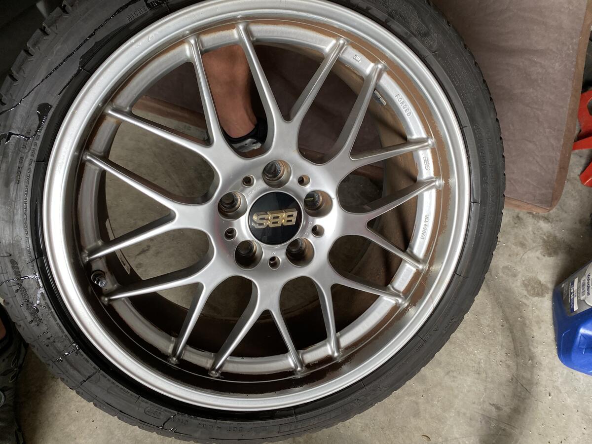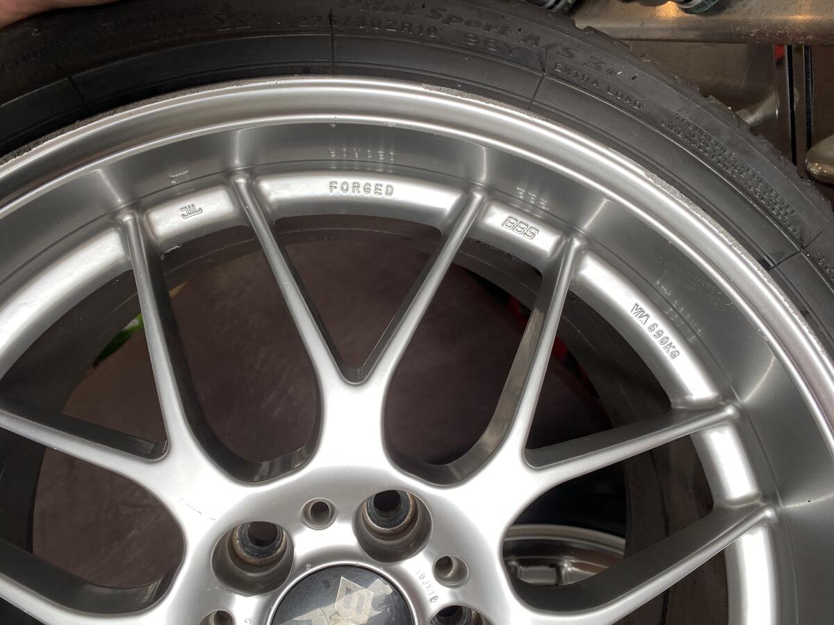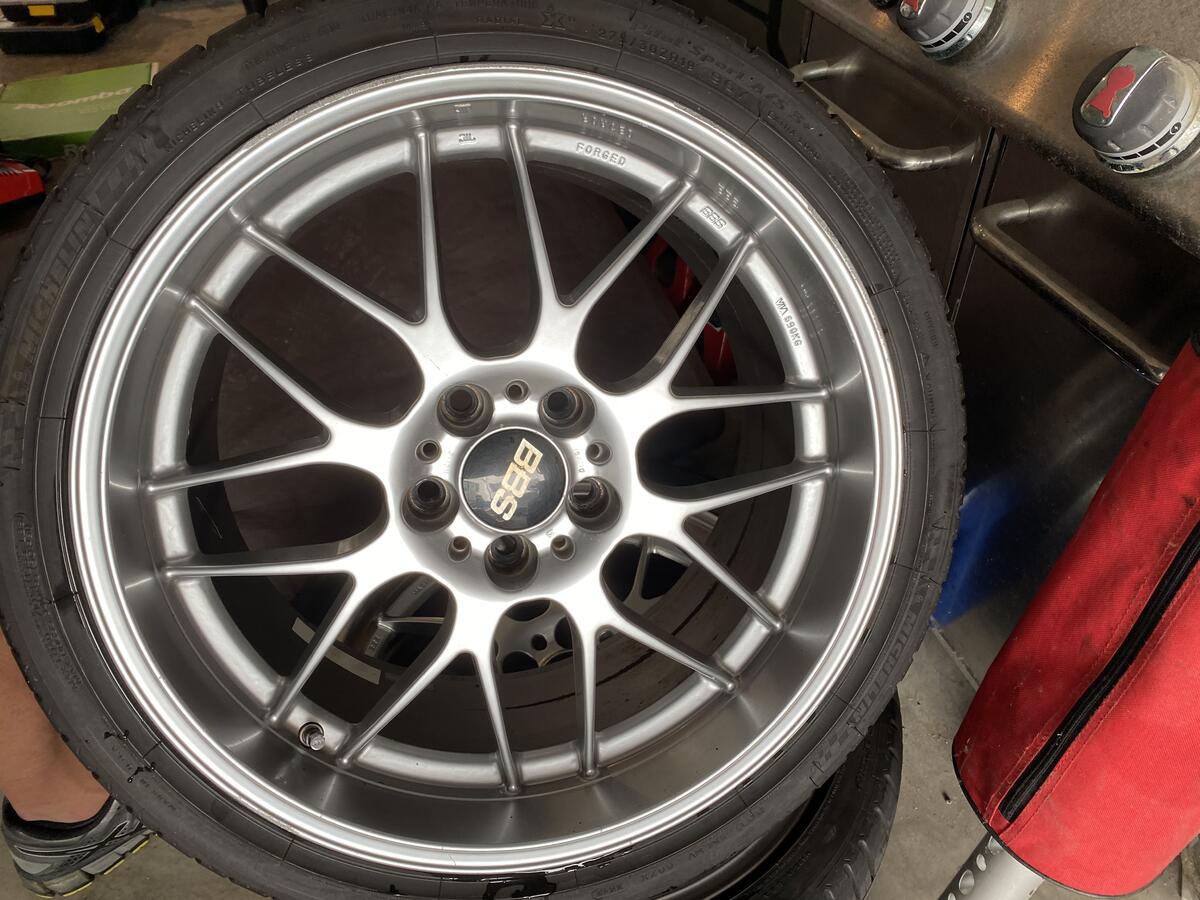 I have a set of BBS RGR that suffered some surface damage to the paint finish due to some track brake pad dust. Mainly the front wheels. One rear wheel is in great shape, the other is pretty good. The two fronts need refinishing pretty badly. Photos below one pic of how they looked on the car in their current condition. I will sell for $1000, wheels only. $1500 for wheels with almost brand new Michelin A/S 3+ tires in 255/35 and 275/30. The tires have about 1000 miles on them. Refiinishing will run $125-150 per wheel, so for $1600 these are perfect in what ever finish you'd like.