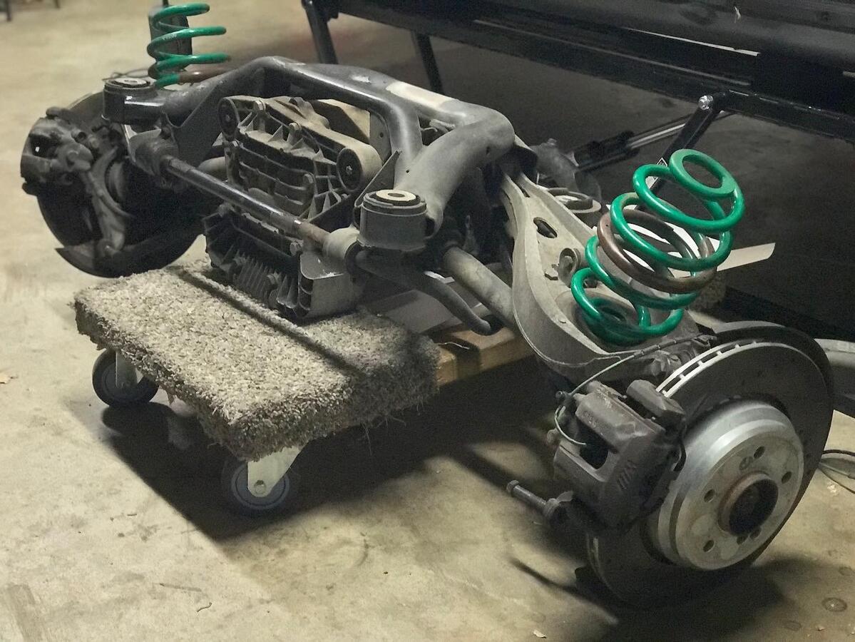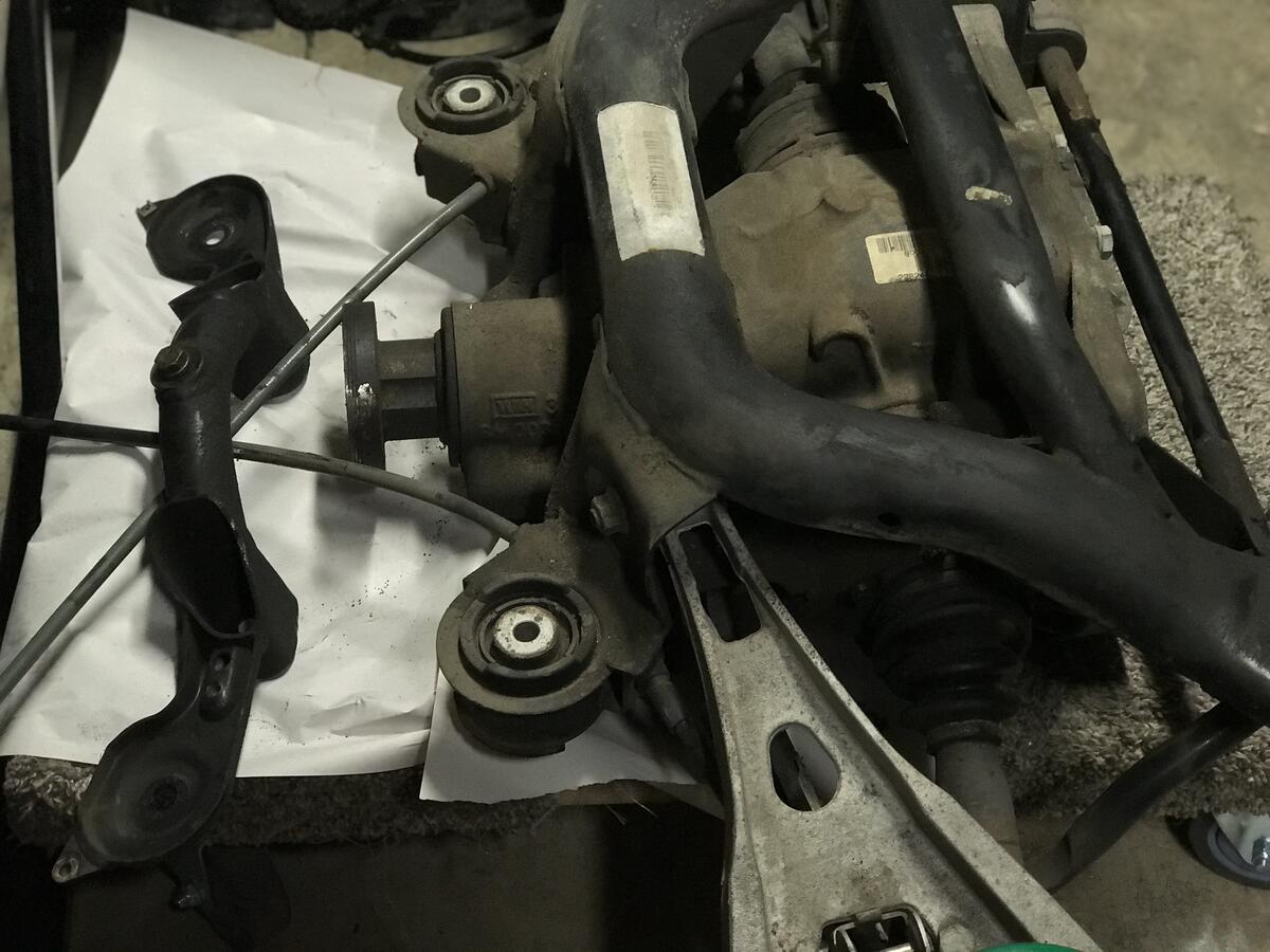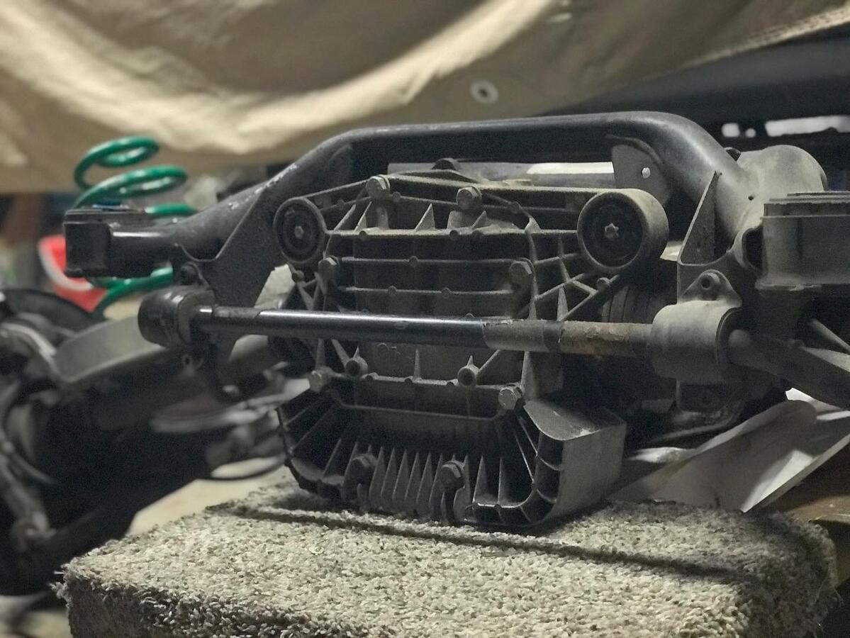 Available for purchase is a used OEM E46 M3 rear subframe with OEM 3.64 LSD and M3 axles pulled from my personal 2002 E46 M3 Coupe with 162,XXX street miles. It includes upgraded Rev-Shift polyurethane RCAB bushings, ECS differential drain plug, drilled and slotted brake rotors, and Tein rear lowering springs. Zero leaks, no strange whines or clunks prior to removal. It can be installed as-is, but I would recommend replacing the aged OEM differential bushings and subframe bushings.