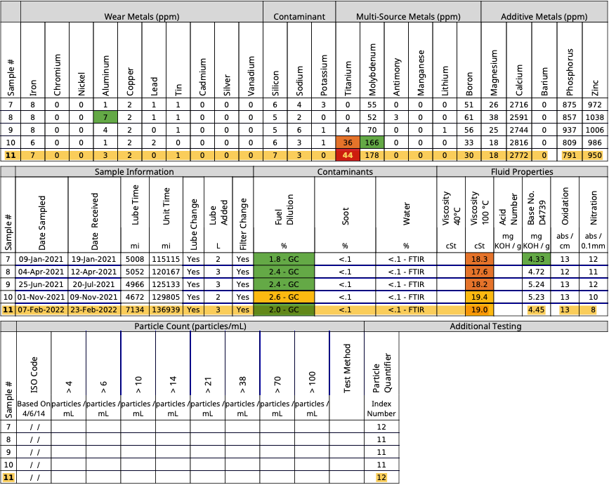 Seems like the formulation has changed. Maybe this is due to BMW's recent switch back to Castrol. Might explain the Ti and higher Mo (Castrol has been using Ti as an additive for a while). Different wear metals profile in this report, too. Starting to wonder if I now have to throw out most of my UOA history. Ugh.