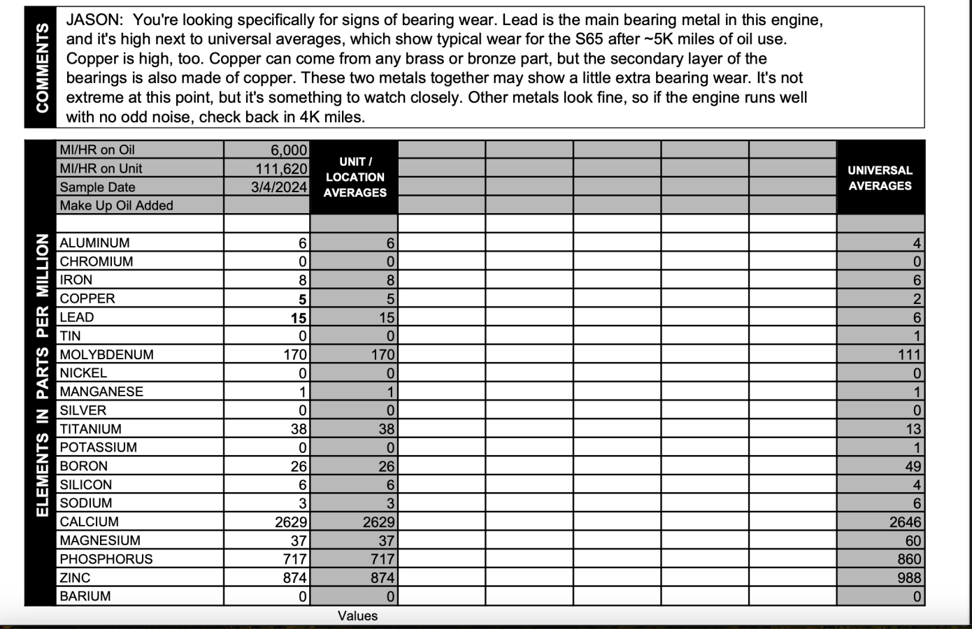 Looks good. Which company did you use for the oil analysis?