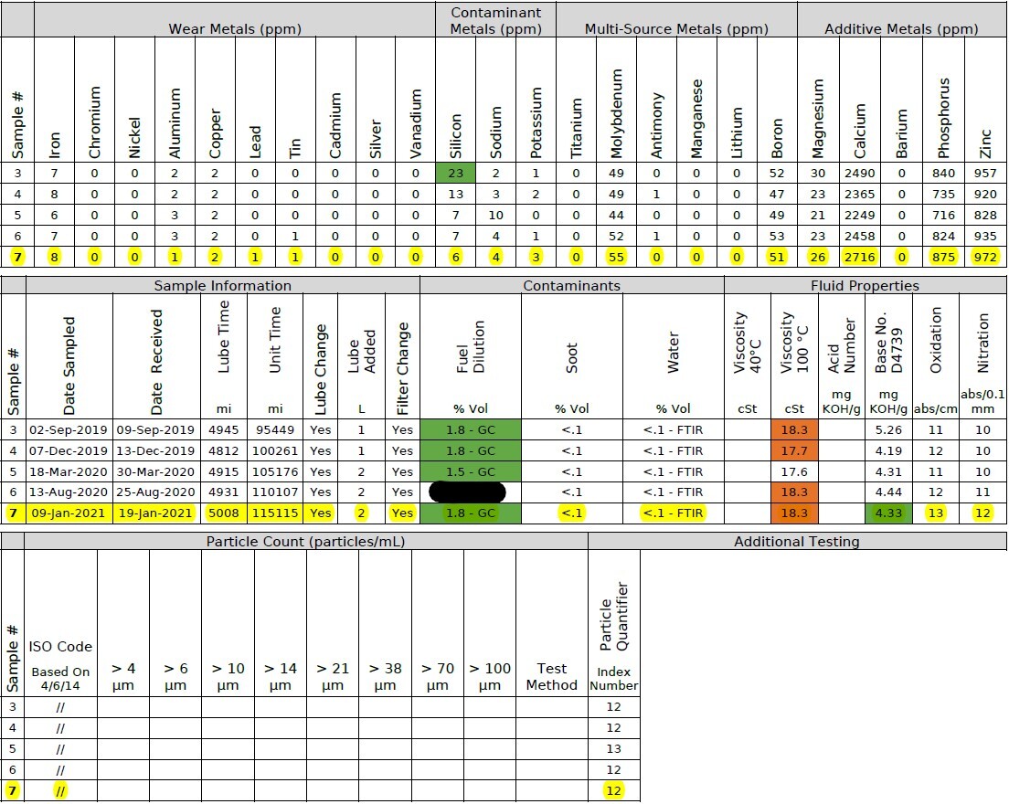 Now at 115115 miles on the engine. 5008 miles on the oil in this sample.