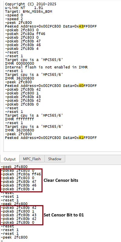 If you wish to place the ECU in censored mode, that can also be done using similar commands as above. However you must ensure that the IWS bit in the shadow block is set to 1 if you wish to retain the ability to clear the censor. If it is set to 0, it is not possible to clear the censor bits. From my testing with the MSS65 in this state, the ECU itself also appears to be rendered incapable of running its internal flash/erase routines -- effectively rendering it a brick if you have an incomplete program. I am not certain if that would be the case on the MSS60, and I don't intend to find out