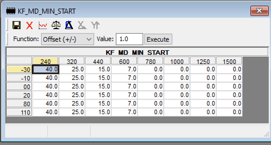 This function describes the amount of torque the DME tries to generate at the specified coolant temp and RPM during the engine start. The columns are RPM, the rows are coolant temperature (in ºC), and the actual table entries are torque (in Nm).