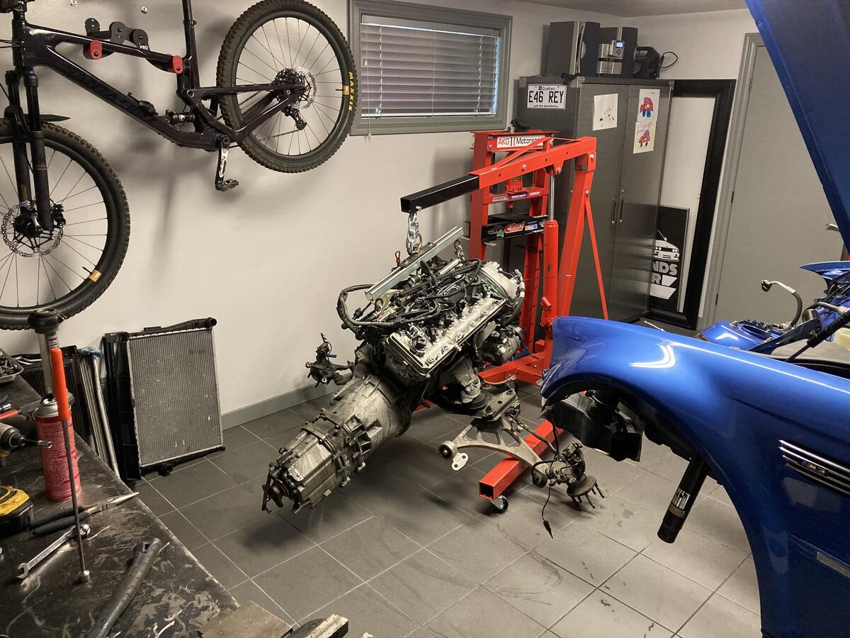 To remove engine from the front of the car, ideally go to a garage prior to starting so they can pump out the HVAC system. Then remove the front end and drop the complete front end assembly directly with front subframe. If you need to move the car as a roller than reinstall the front subframe assembly.2006 BMW E46 M3 Individual Estoril blue Sold