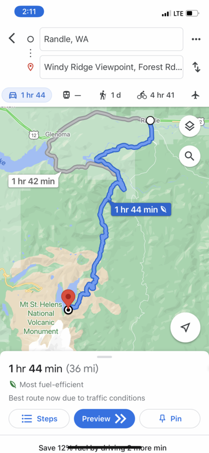 Mt St Helens. It’s closed in the winter so this route isn’t exactly correct, I mostly drive NF-25 which is the other twisty road going south from Randle, and then there’s a turnoff to Windy Ridge.