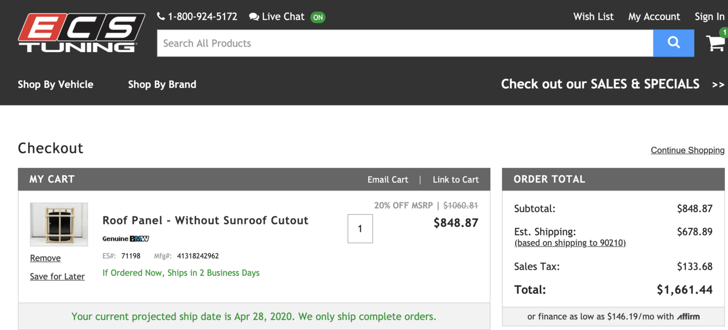 Where would you order an OEM slicktop roof panel at a reasonable price? ECS shipping and taxes make it about the same cost as a carbon one shipped from Karbonius.