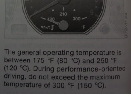 3/4 dot (255ish) isn't crazy hot for oil on track. Those dots on the gauges are supposed to represent the operating temp under normal circumstances, so 3/4 on the gauge is still fine for the street according to BMW, let alone the track. Like the manual says in that pic above, TWS is supposed to be good up to 300 F.