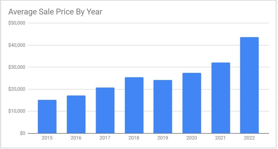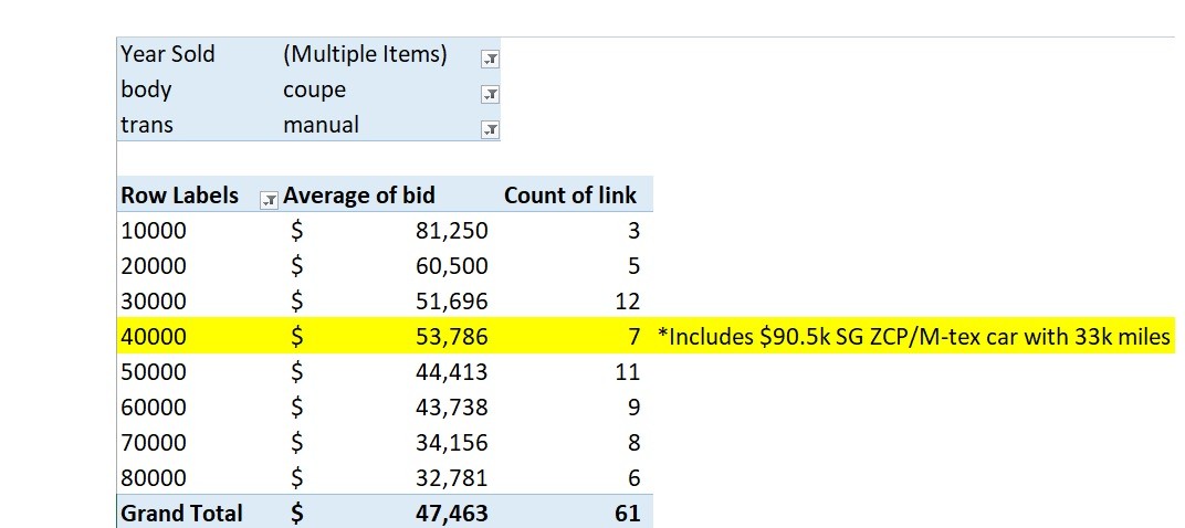 Keep in mind the TiAg has almost half the miles as the LSB car amongst other factors. Using oceansize data, look at the difference in average price when considering mileage increments of 10k for manual coupes (only looking at '21 and '22). Also note that the <=40k mile category includes the $90.5k SG ZCP/M-tex car (https://bringatrailer.com/listing/20...m3-coupe-73/); without it the average price falls to $47k in that category (following the natural trend):