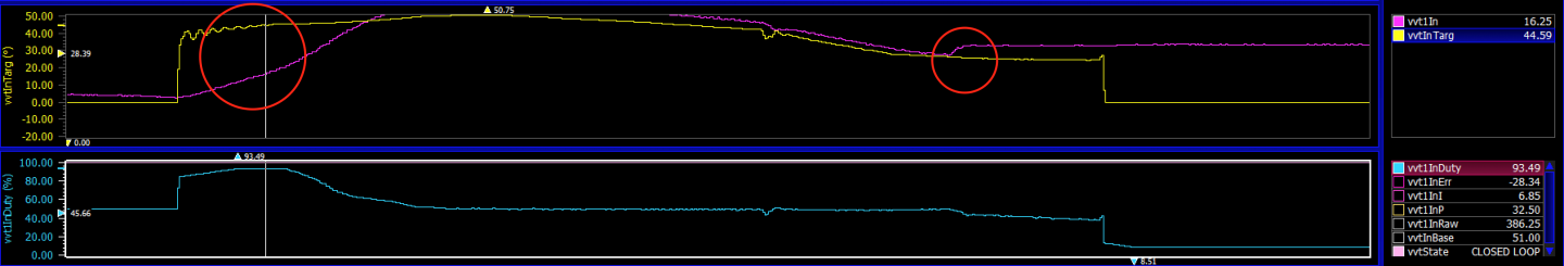 I am having an issue with the intake cam sticking intermittently. It will lazily move to its target position, then not return until seconds after. The picture below is 2000rpm-5500rpm log, yellow is the target, purple is the actual position, and blue is the duty. It increases duty to try to get it to move, which it does slowly. Then it increases more towards the end for no apparent reason, then does not return to the target after. The solenoid, vanos seals, and diaphragm springs are all new. The exhaust cam is also working fine.