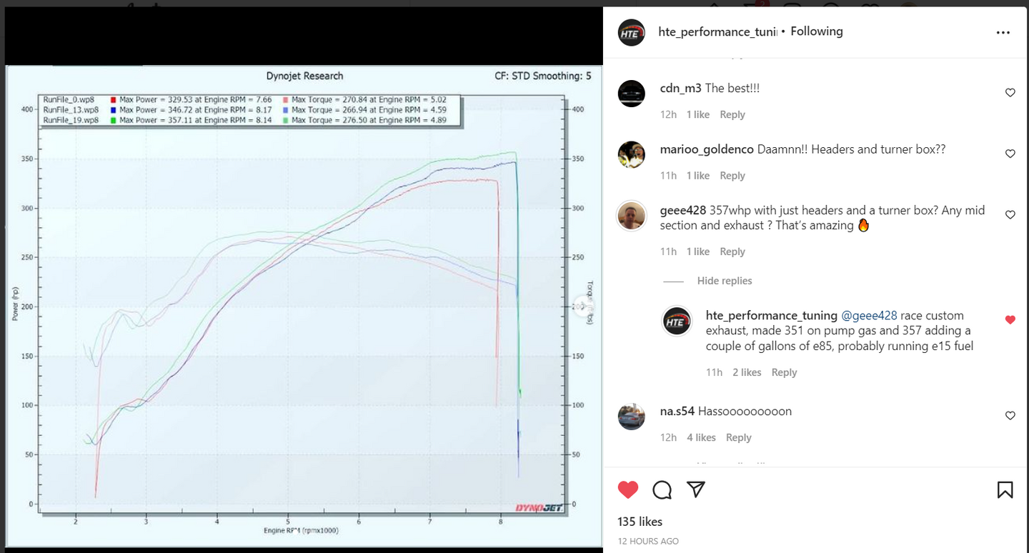 I’ll try to get a baseline for my track car. Currently it has CPI headers, BW race exhaust, and SPAL fan only. We’ll see what it puts down after it gets a Karb intake, IAT relocation, and HTE tune. 350-360 WHP would be cool.