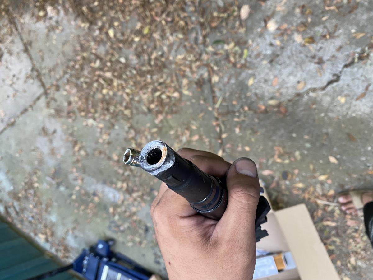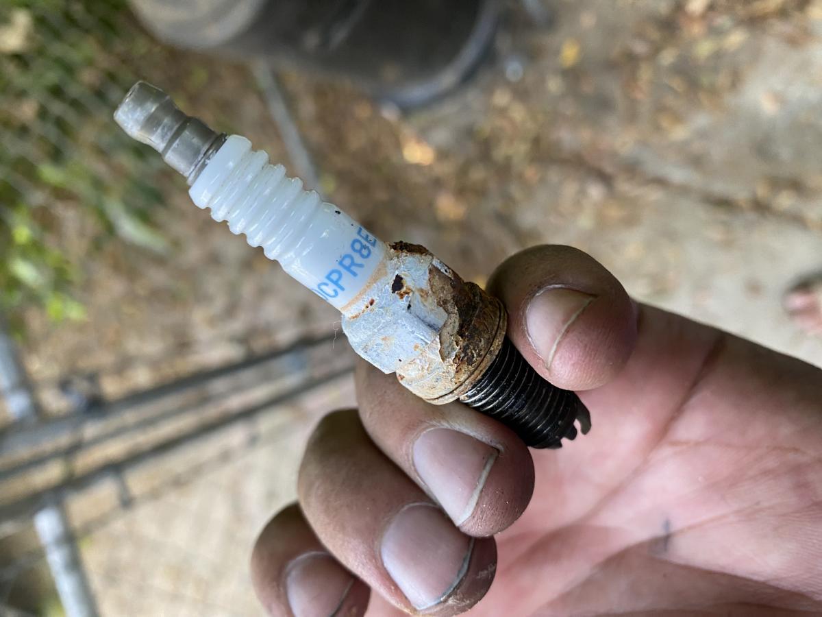 a bunch of white and rusty residue at the bottom of the spark plug well and around the base of the spark plug..