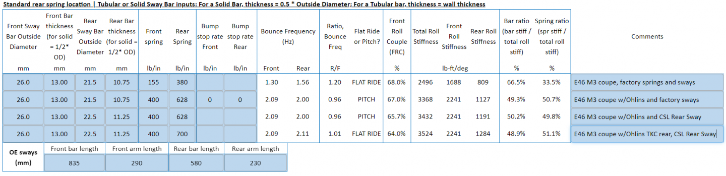 I am interested to learn more about Total Roll Stiffness as calcuated in the FCM Ride Harmony tool, because that number changes significantly with the mods I'm contemplating. I have the GC Front Bar on/order, I have 700# TCK rear springs on/order, and I have a CSL rear sway in the garage as an option. I do not intend to test a different spring rate in the front.