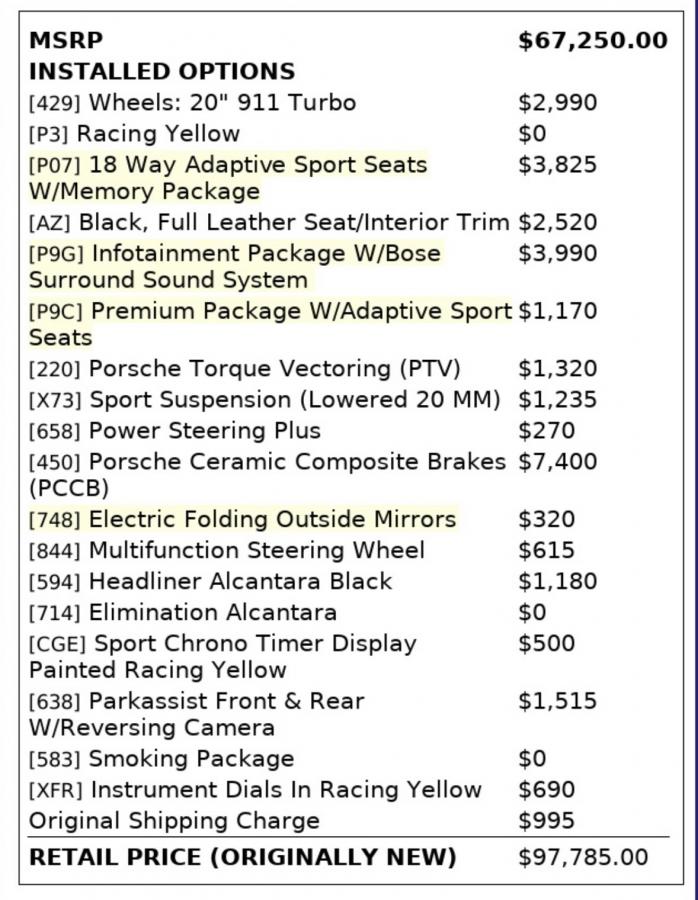 I’m priced out of the GTS 4.0 and GT4, and I’m not interested in a 987. I like this 981 GTS. It’s optioned almost perfectly…the only thing I might want to change are the wheels. The PCCBs get me yellow calipers so I get to avoid the McDonald’s look, but I’d be iffy about tracking with them ($12k per axle!). Thankfully Girodisc sells steel rotors for $1300. Speed Yellow, full leather interior/lack of alcantara, and sub-10k miles are selling points for me.