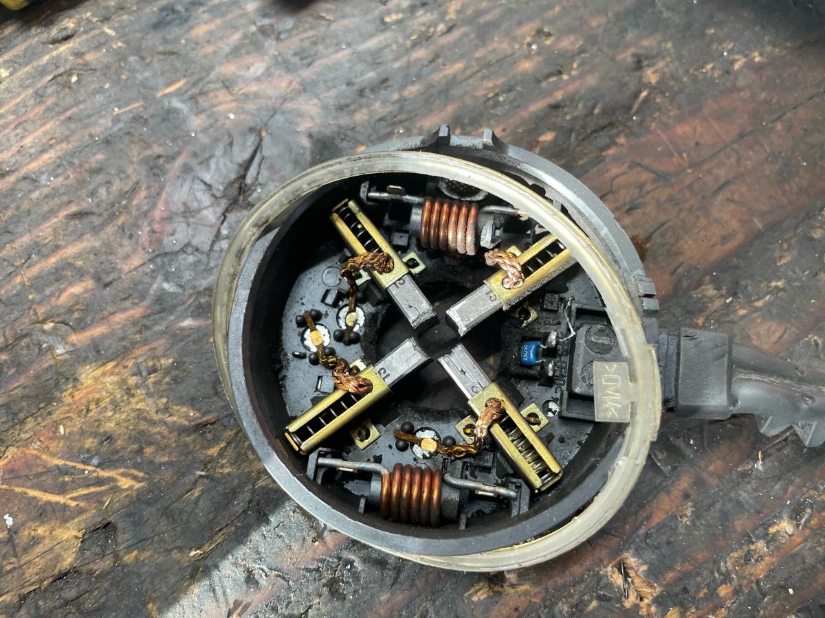 I've started researching about the SMG Pump Motor since my M3 started to drop me out of gear on hot weather and give me the cog light on a regular basis. I knew my pump motor is on the way out since everything else was working fine. Sometimes I'm cheap and like to experiment so I got curious about the motor itself. I couldn't find a lot of information what exactly fails in these motors, but couple of information bits pointed to the commutator. I was pretty sure I had the same problem. For me the smg pump motor always looked very similar to the ABS/DSC motor, so I went to a junk yard and pulled a ABS/DSC motor from an E46 Convertible. Off to the car and out with the pump motor. After opening the situation was clear. A lot of debris and the commutator was living on its last bits. Worn to the plastic core.