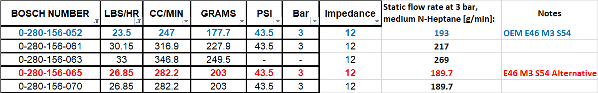 So I have no idea where I got this spreadsheet, but the information seems specific enough that I suspect it is real Bosch injector data