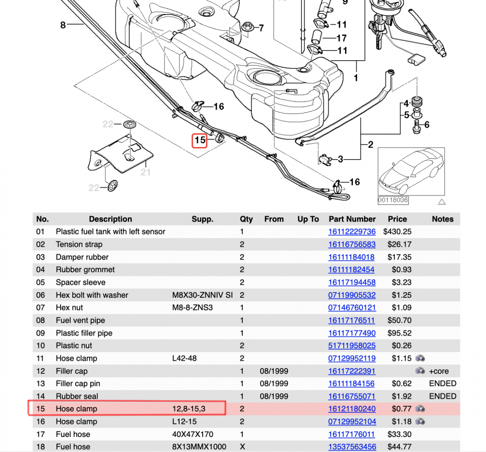 I ordered 16121180240 which is what RealOEM says, and FCP sent me the correct parts. But these are too small. The hose is about 25-26mm and the clamp is only good up to 15.3mm
