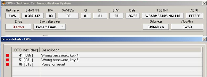 Connected the car to the INPA s/w again today to check some data and while cycling through with key # 5 in the ignition, noticed that all of the EWS conditions for the key had changed and that the s/w showed that the car would start. Sure enough, turning the key to start resulted in the car running. After running for a short while, turned the car off and the INPA s/w reverted to showing a problem with the password and the rolling code (no more starting). This is driving me nuts! Checked the key again in the AK90 and it still is not showing a VIN nor the mileage. I am having a hard time understanding how the key could be corrupted and at the same time it occassionally will start the car. And also, shouldn't key (# 4) that is registering correctly on the AK90 always start the car since it reads correctly and the car treats each key uniquely?.