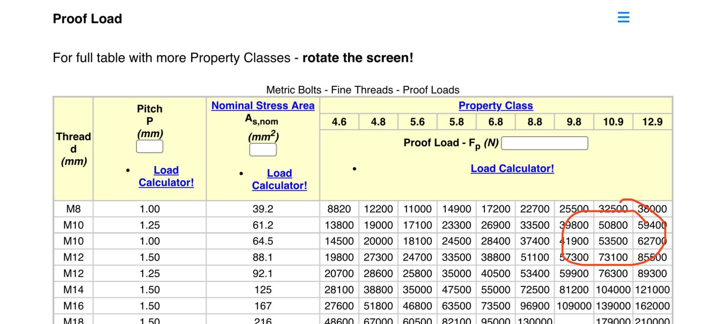 Proof load (pure elastic) of an M10 10.9 fastener is ~ 53500 N @ 82 ft-lb