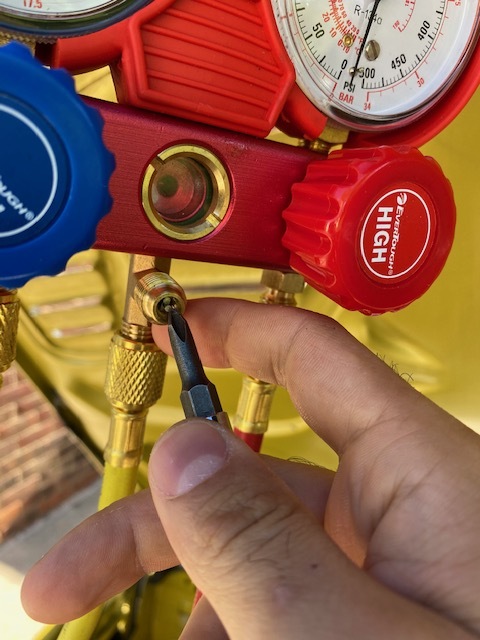Step 17: We are now ready to fill, except your yellow/middle hose contains atmospheric air which we need to purge first. There is a valve at the manifold gauge above where the yellow/middle hose attaches. Press this valve with a screw driver and let the air in the hose out. This should take 1-2 seconds. Do NOT let too much r134a to escape this valve as you will throw off your calculations. We don't want to lose too much R134a