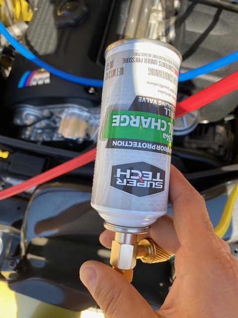 The system is filled by weight, and not by pressure. It calls for 25-27 oz of R134a. You will need Two 12oz cans of R134a (without additives such as oil or stop leak) and one 3 oz can of oil recharge (usually contains 1oz of r134a and 1 oz of PAG oil and 1oz of additives). Make sure the 3 oz can of oil recharge you get contains PAG 46 oil. PAG 100 or 150 is NOT compatible with e46 system. An alternative method is to use another 12 oz of r134a instead of the 3oz bottle of oil additive. You will weight this last bottle on a scale and add the appropriate amount. I did not have a scale and to me that is just one more variable to worry about.