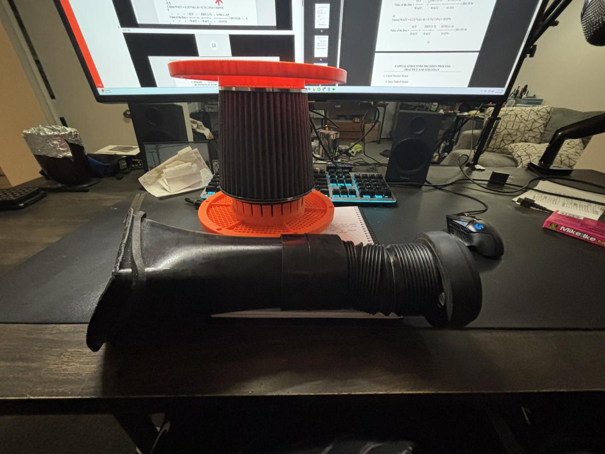 My current setup is a K&N Filter with an aluminum pipe running to an ECS Silicone Elbow to the stock airbox. This was a cheap alternative to switch back from a velocity stack setup. I want to provide better heat shielding to this and a more direct air feed. I plan to use the headlight intake duct as the sole air feed for the engine. This frees up the ability to use the fog lights purely for brake ducting and ditching the kidney grill feed. This is likely net neutral in terms of weight, but allows me to close off the kidney grills and brake ducts as I start experimenting with cooling.