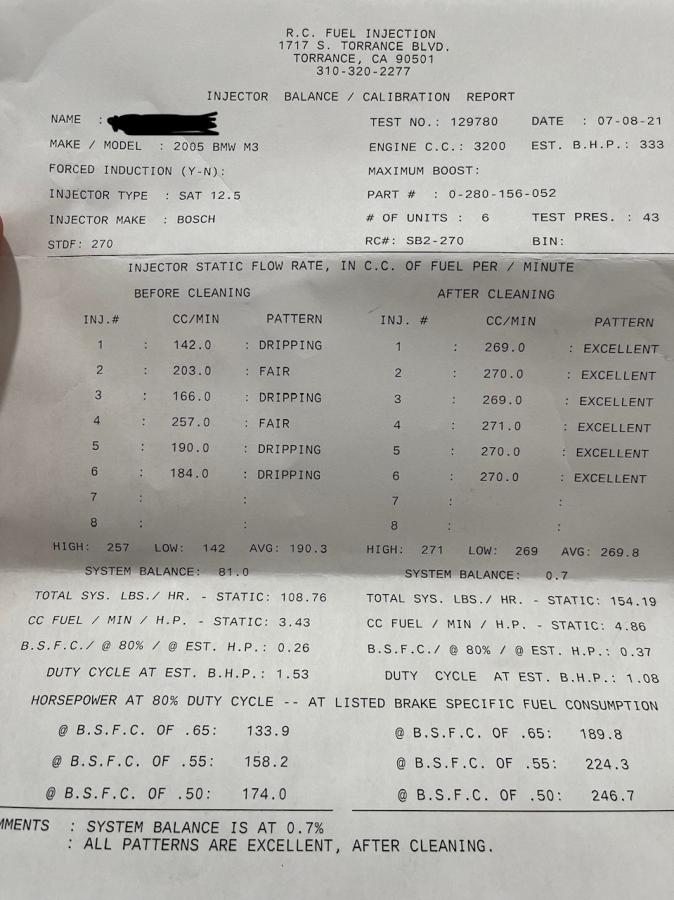 Since my original tune from Paul, I have been chasing where the lost power was coming from. After performing the compression and leak down tests I started looking at the fuel system. My fuel pump, FPR, and injectors are all original to the car so I replaced the pump and FPR, then got the injectors cleaned at RC Injectors which is local to me in Torrance, CA. The injectors were in pretty bad shape from the pre-cleaning flow rate, so I though that might have been an issue.