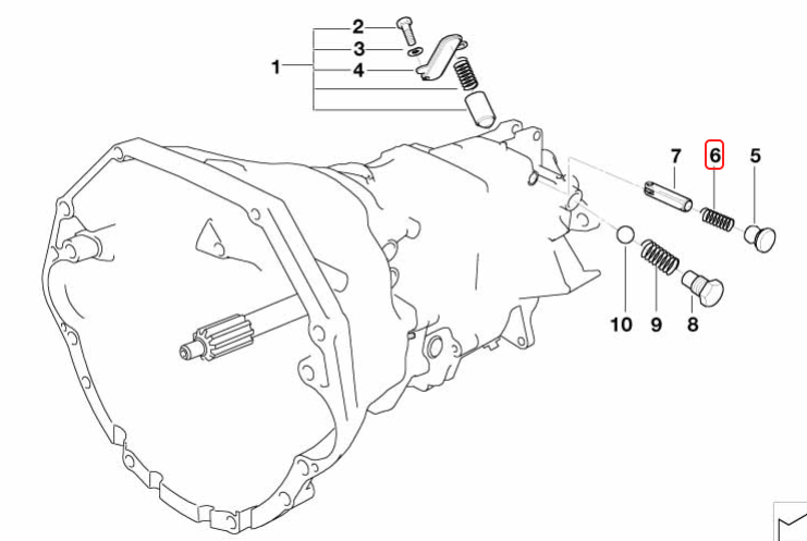 @bimmerfan08​ thanks for putting this info together with the great pics and sharing. It really should be noted here that the compression spring replacement in post #1 is applicable to the manual transmission. This is what you refer to as #8, 9, and 10. The SMG has a similar compression spring however it is behind a pressed in plug and does not have the gear position senor or "thrust pin". All the other detent spings are the same between the manual and SMG, except of course SMG does not have the two closer to the belhousing.