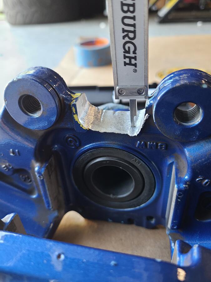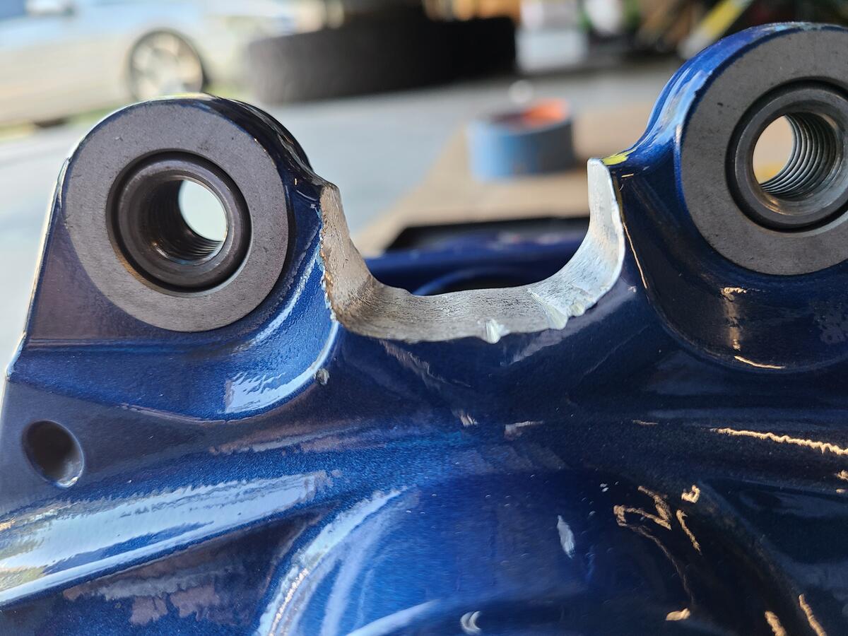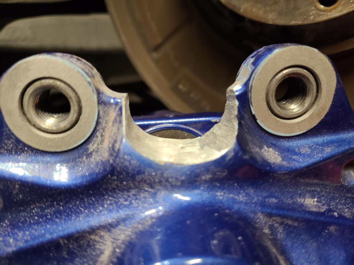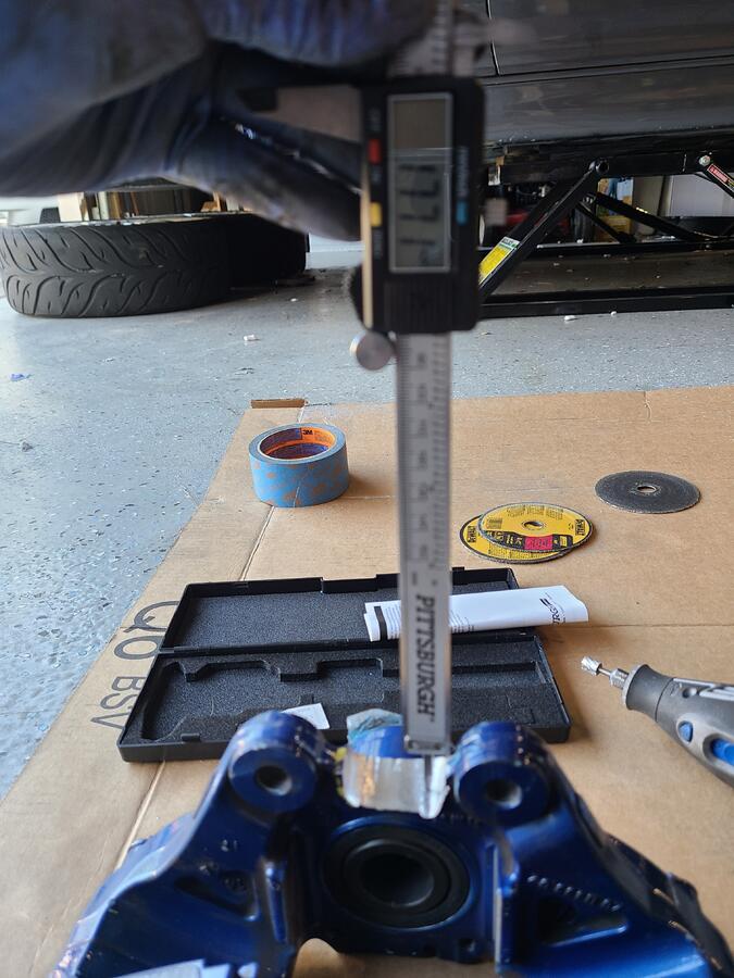 Step 8: Cut and grind the center of the rear calipers to fit. This is probably the worst part of the install because depending on your tools, it may take quite some time. I used a combinations of an angle grinder, dremel, and die grinder to get desired shape and it took about 1 hour per side. However, I was being really careful to not remove too much material. Some people have done it in a few minutes lol. I also tried my best to keep the radius the machine shop originally made to prevent a stress risers at the inner corners. Here is where I ended up: