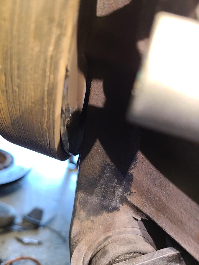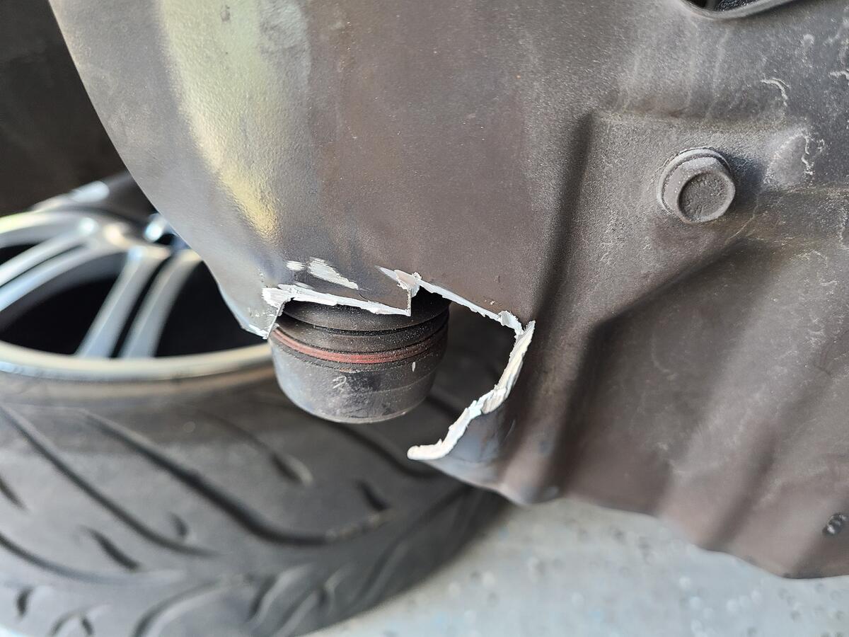 Step 13: The shield has to be modified slightly to fit. Bend the shield all around to prevent contact with the rotor. I could not bend the shield enough at the Tie Rod section to permanently deform the shield, so I ended up cutting a small section around the Tie Rod. One other thing not shown in the ear on the bottom right side (5 O'Clock position) had to be bend almost all the way back to fit the caliper.