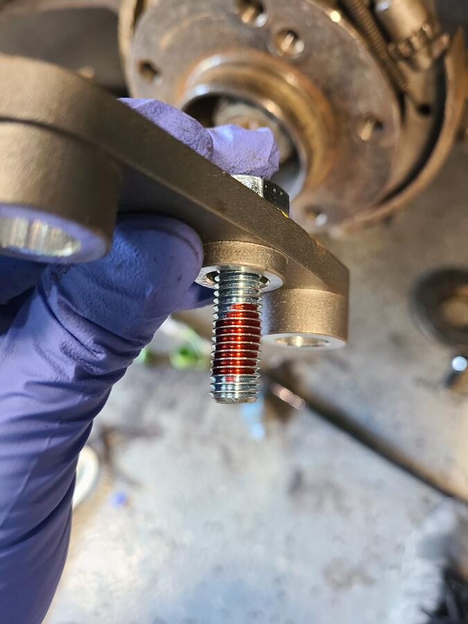 Step 7: Attached the caliper mounting brackets onto the car. Since the M10's will likely never need to be removed, I used some loctite red on them to ensure they don't budge. Place the nuts on the other side and torque these bolts down to 48 ft-lbs.