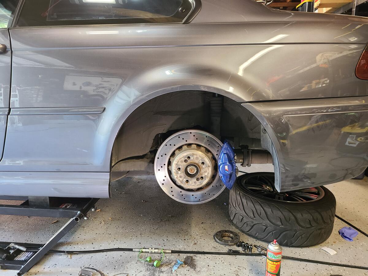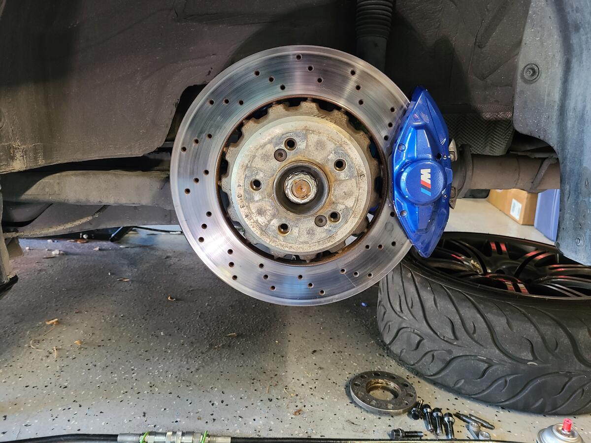 Step 9: Install Brake lines. If you have new lines, connect those to the car, then spin the caliper on to the line fitting. Thee OEM E46 M3 lines can work but I would not recommend it as there is a lot of stress on the line. As a temporary solution, I used the OEM M4 brake lines which were probably a few inches too long, but they get the job done. I will get some E46 M3 SS lines made with 90 degree to connections later as a permanent solution. Make sure you clean off any brake fluid as it will eat up the paint on the caliper.