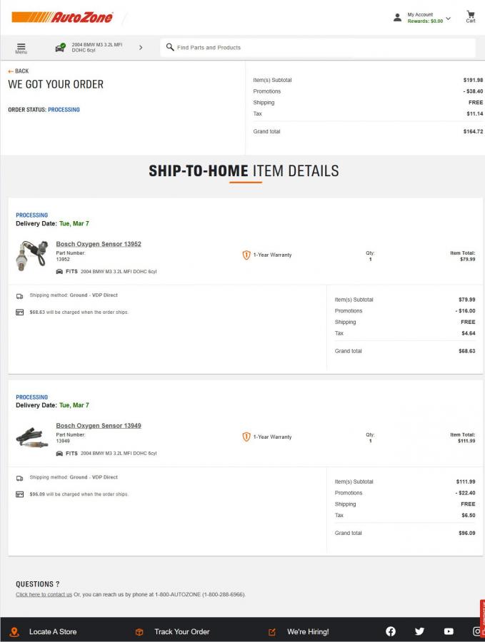 Did the same with Autozone with their 20% off, free delivery,Originally posted by PSUEng View PostI pulled the Bosch P/Ns from their website and ordered from Autozone with an extra 20% off--best prices I found at the time. Running them now, and they work perfectly fine.