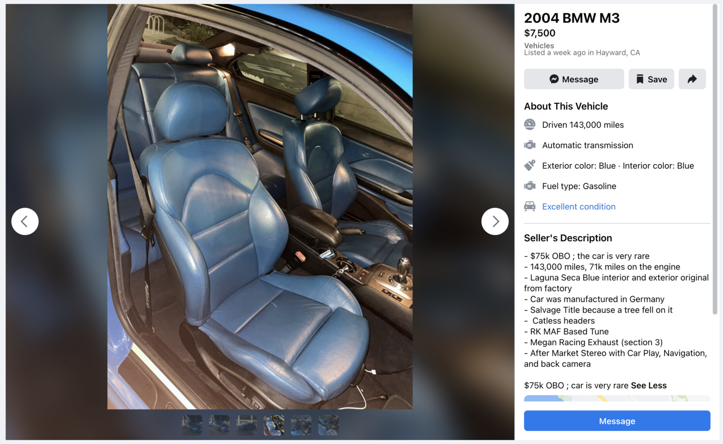 Oooh very rare spec. I especially like the salvage title, cracked leather, blue angel eyes and replacement engine. Only $75k too!