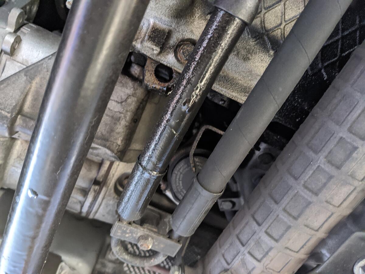 2) While the belly pan was off, I noticed an oil leak as well on the passenger side between the high pressure power steering hose and the steering rack. It appears to be coming from above the oil pan. The part of the oil pan behind the steering rack is black with oil grime. What could the culprit be?