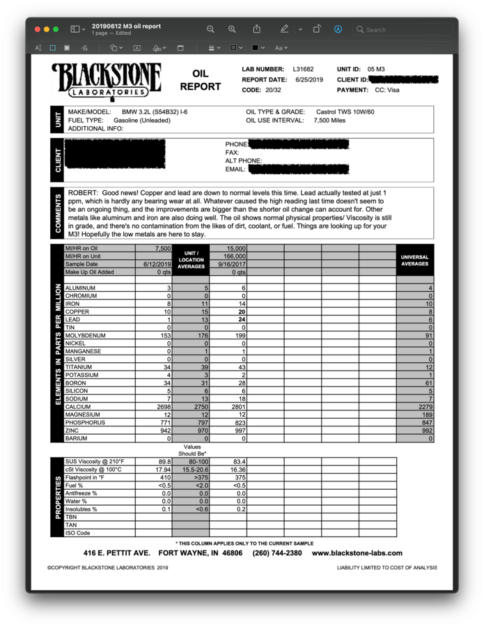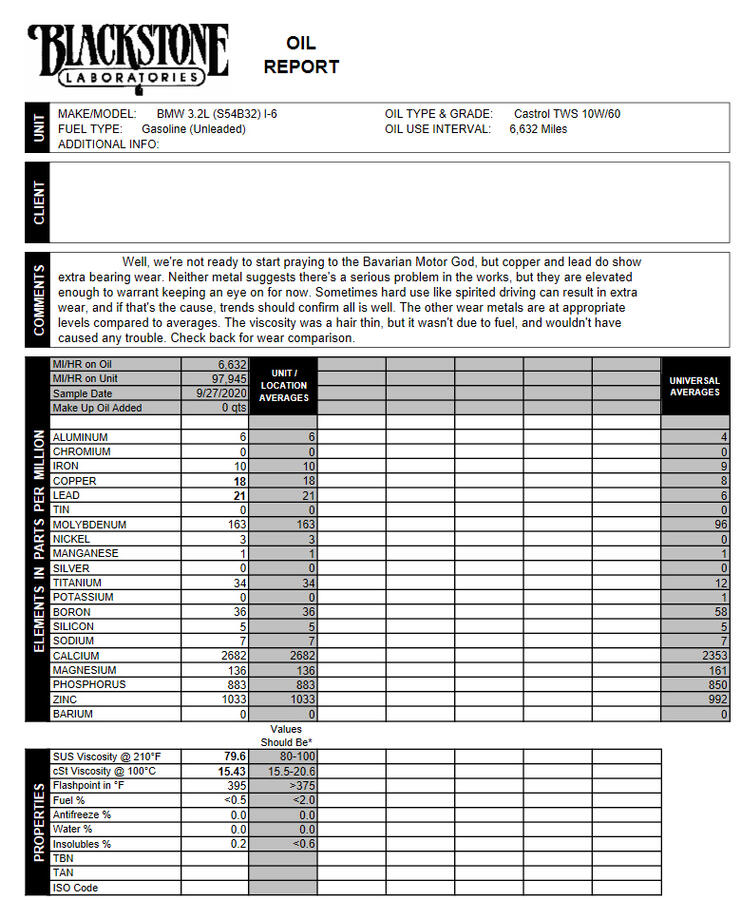 2004 M3 with 141k miles. As far as I know the rod bearings have never been replaced and I was really worried. First report came back with really good news. I have sent out another sample and waiting for results.