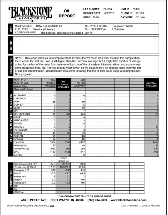 For my current m3, like I said earlier, I bought the car, drove it home, and pretty much immediately took it apart to do all of the big 3 as well as some other work. I took a sample of oil from before the change but I don’t know if I still have it. In any case, I didn’t send it in for analysis.